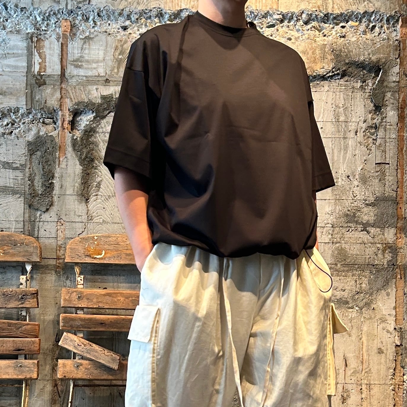 ゆったりとしたサイズ感に加え、裾がドローコードの使用になっており