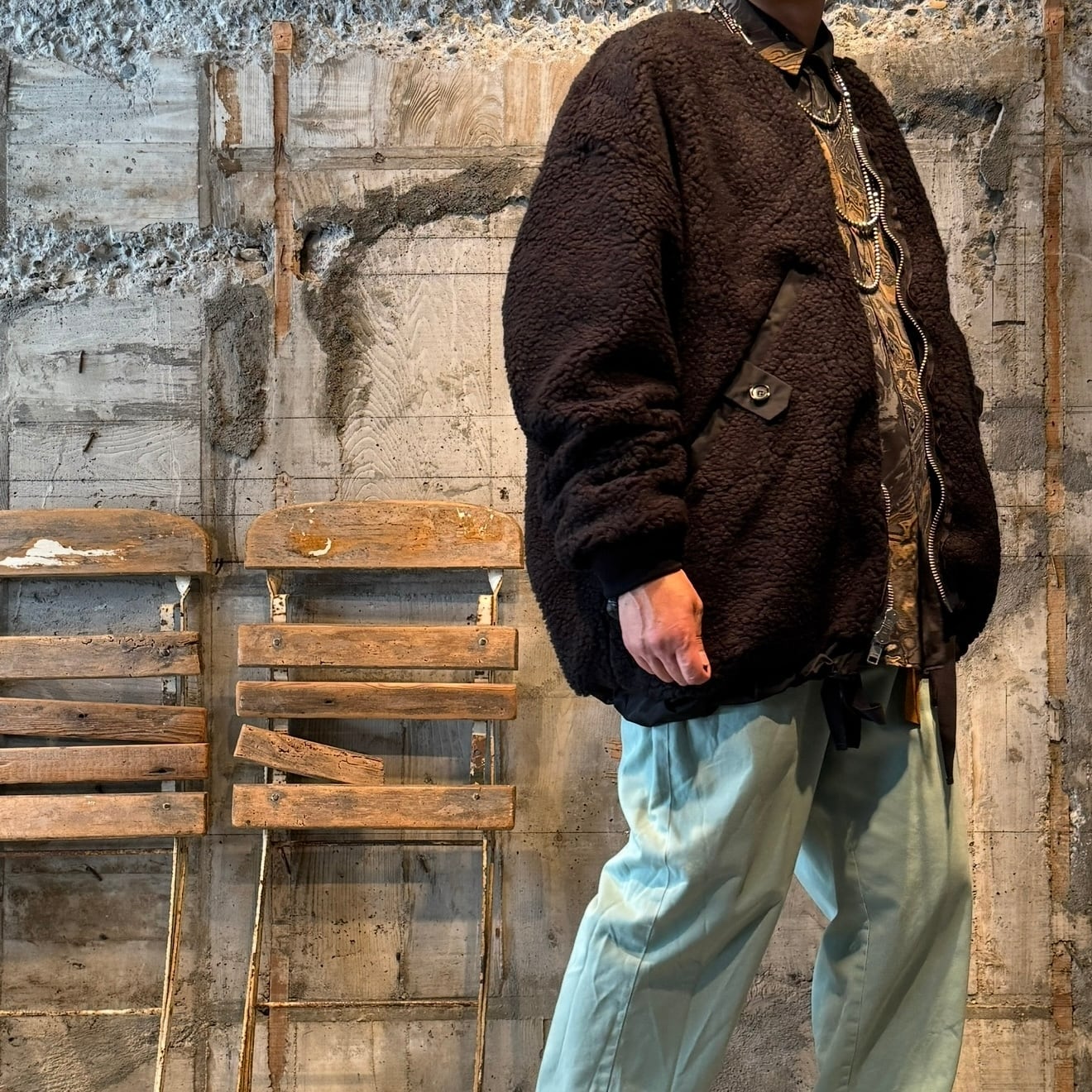 裏側のボアの面はポケットのディテールが、表と裏で変わっており、フロントのZIPもダブルZIPになっており色々な着こなし,ディテールを楽しむ事が出来ます。