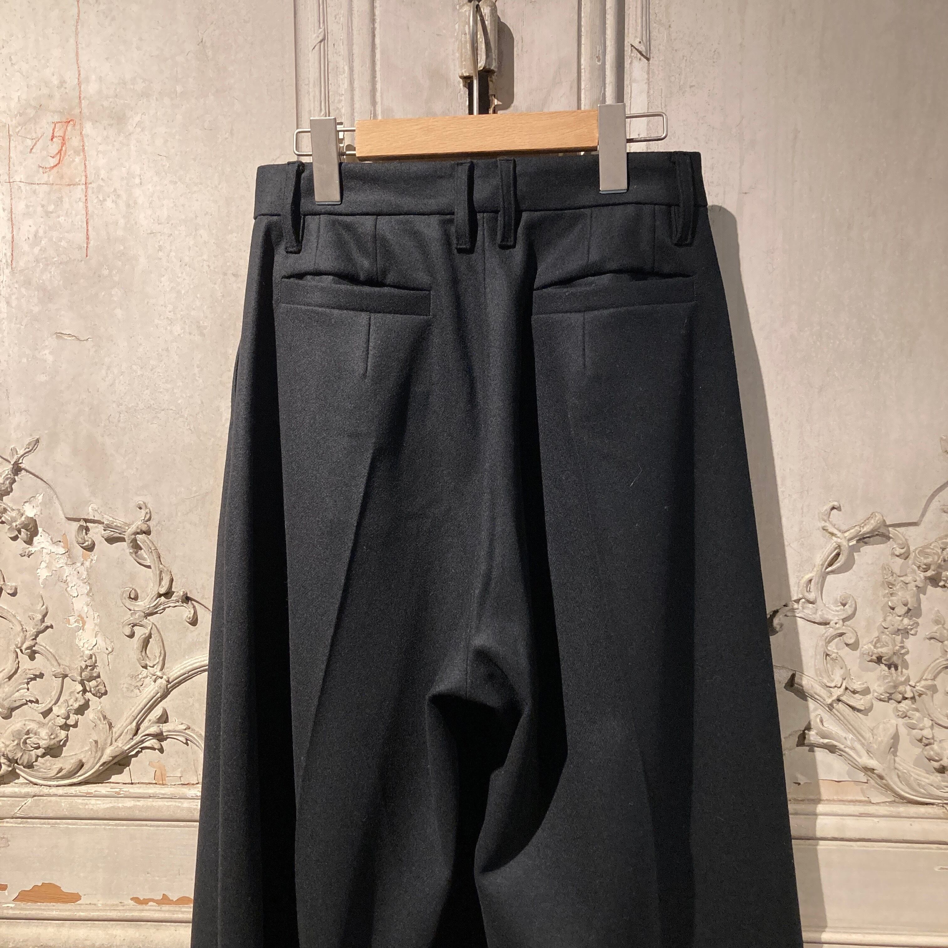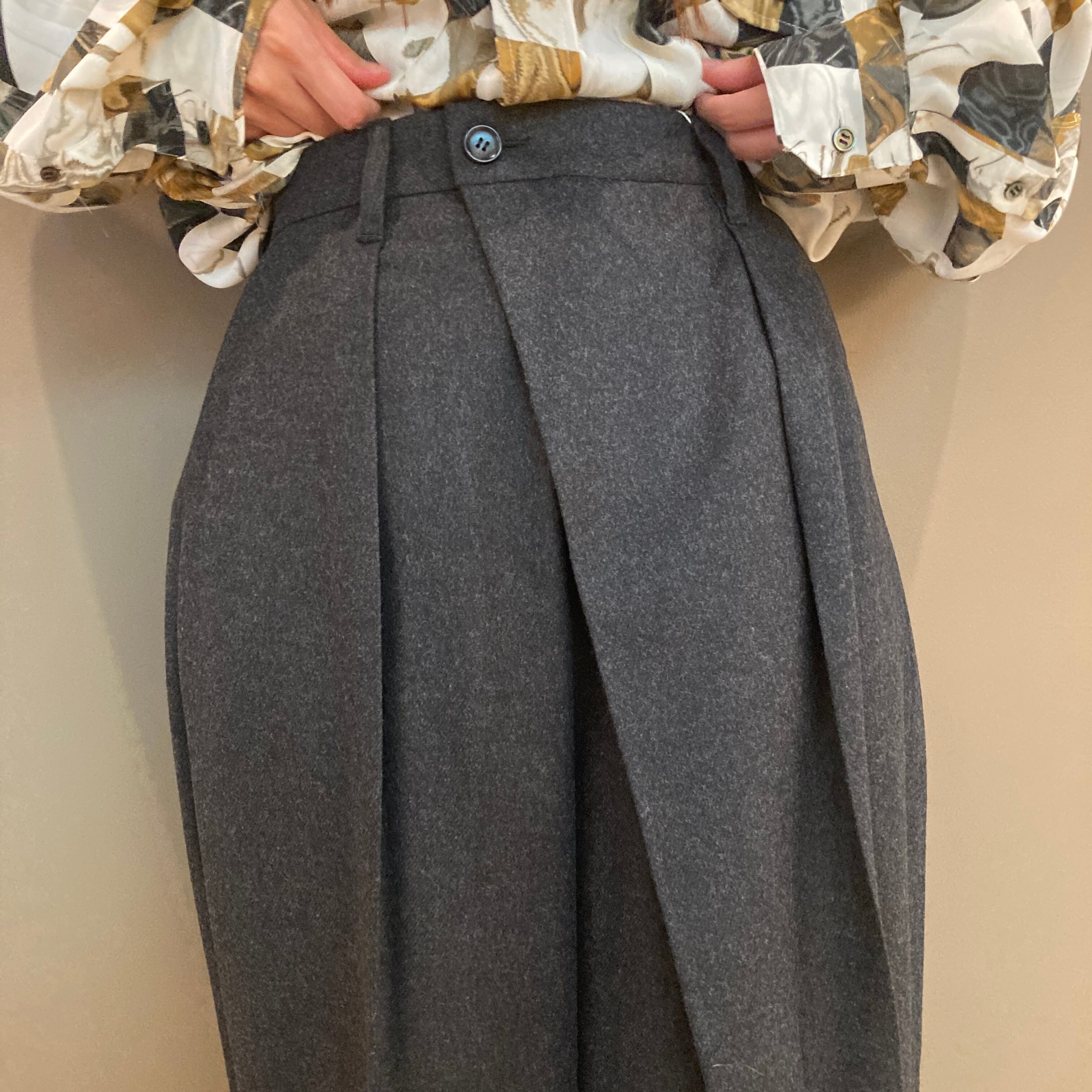 贅沢に生地を使用し、立体的でカーブしたワイドシルエットが魅力なパンツ。