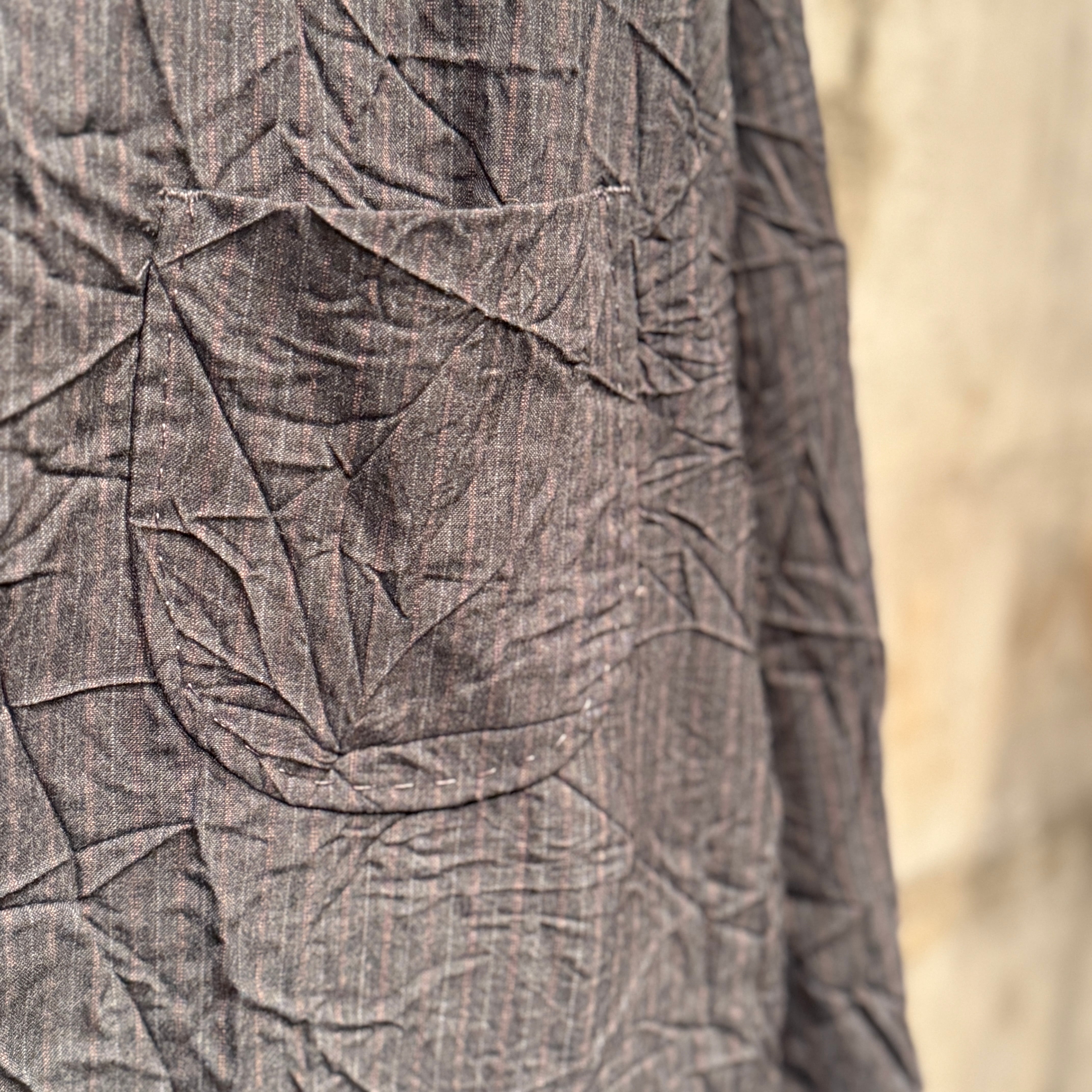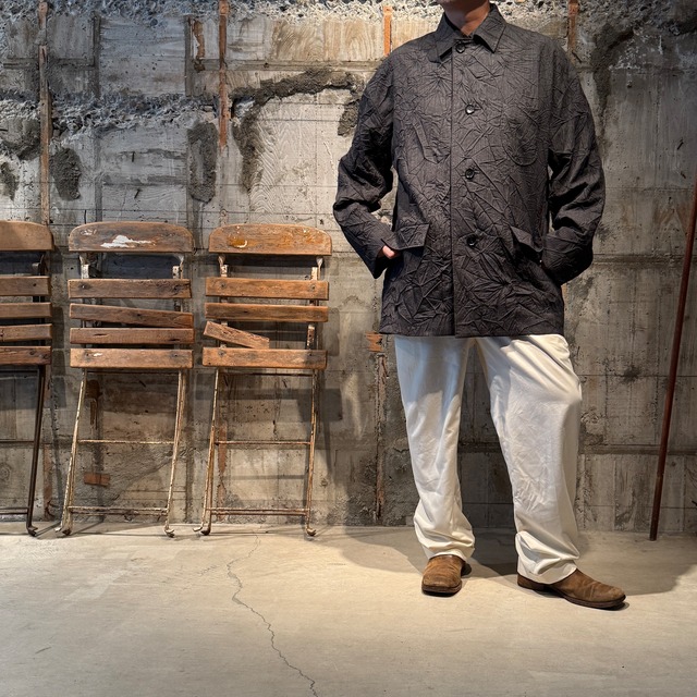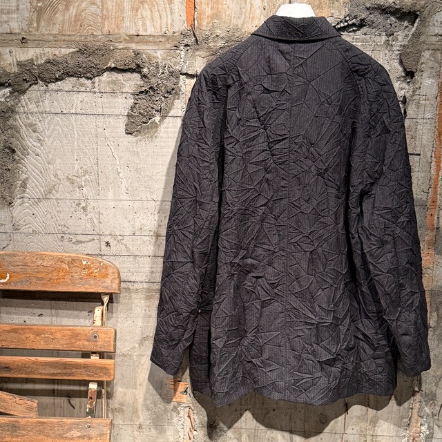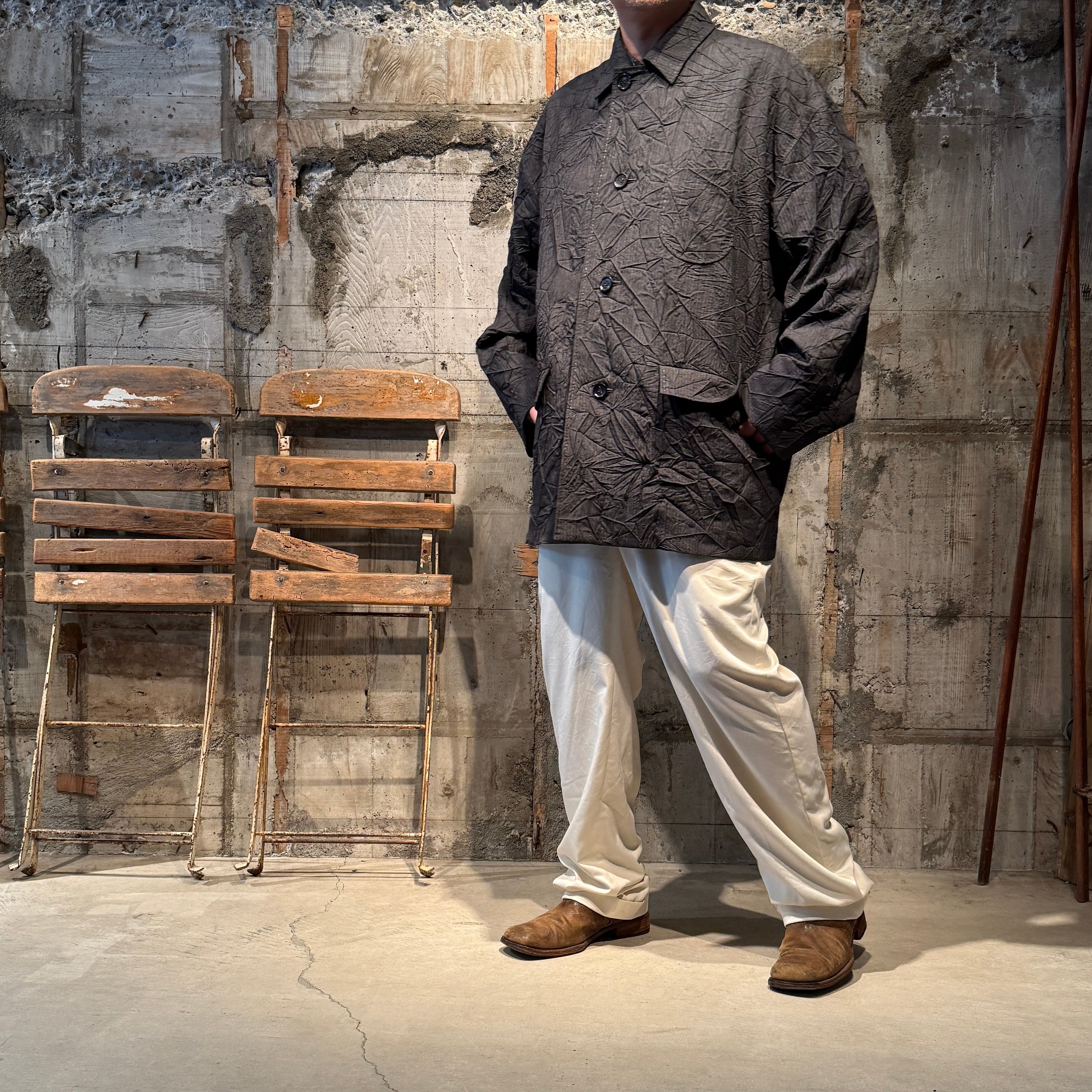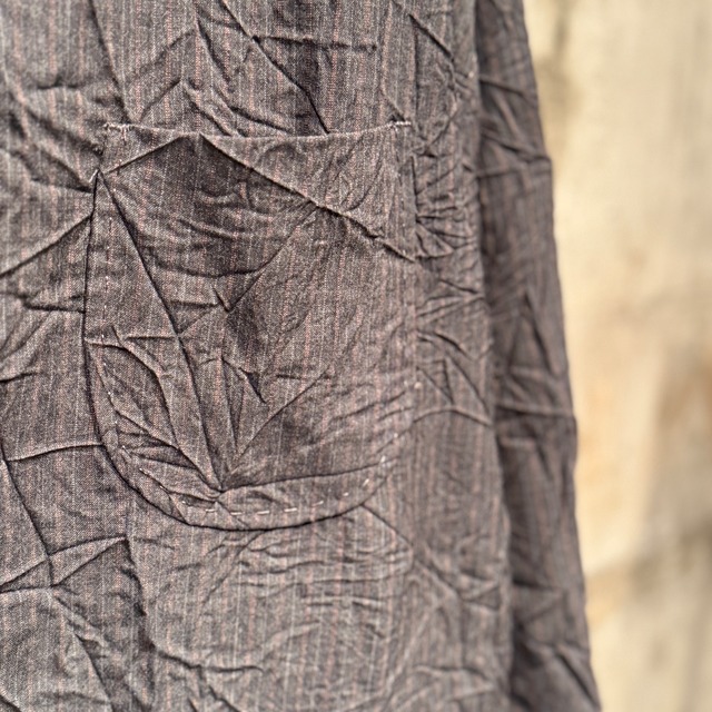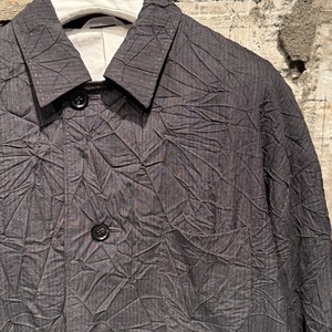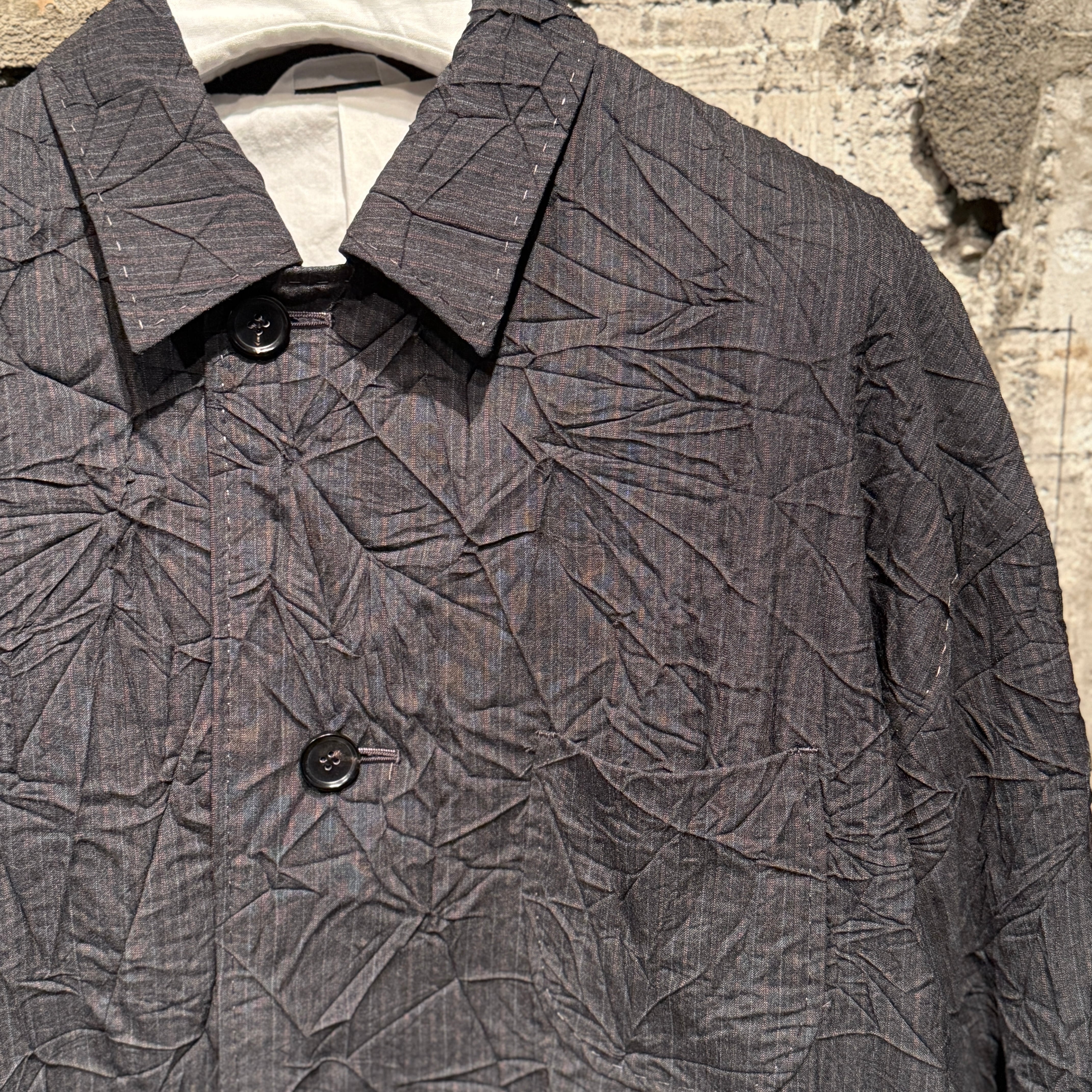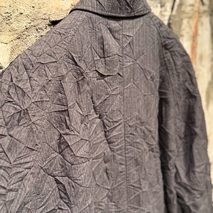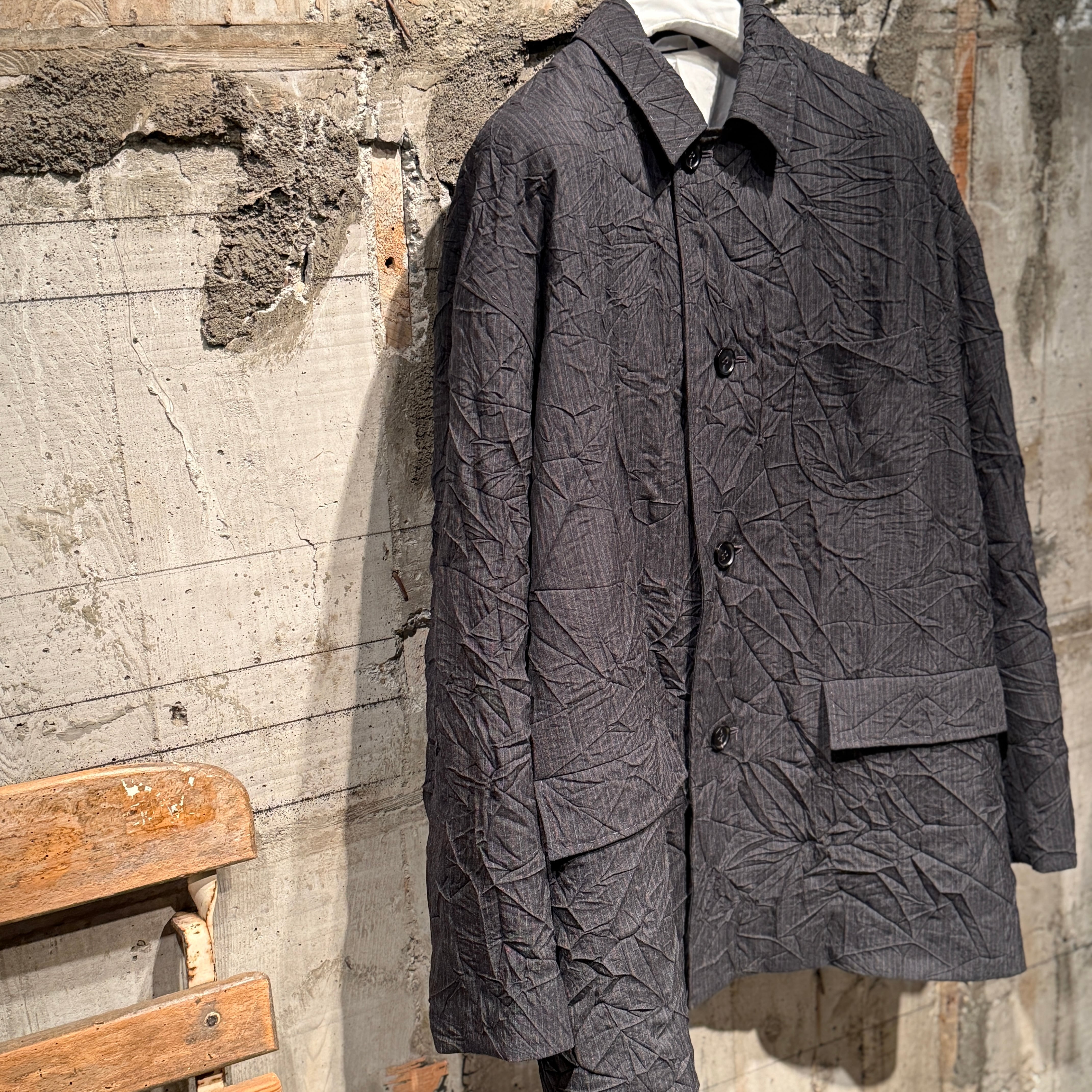 ストライプのウール素材に、キャッチワッシャーの加工を施し、自然なシワ感や立体感が演出されたスペシャル感のあるハーフコートです。