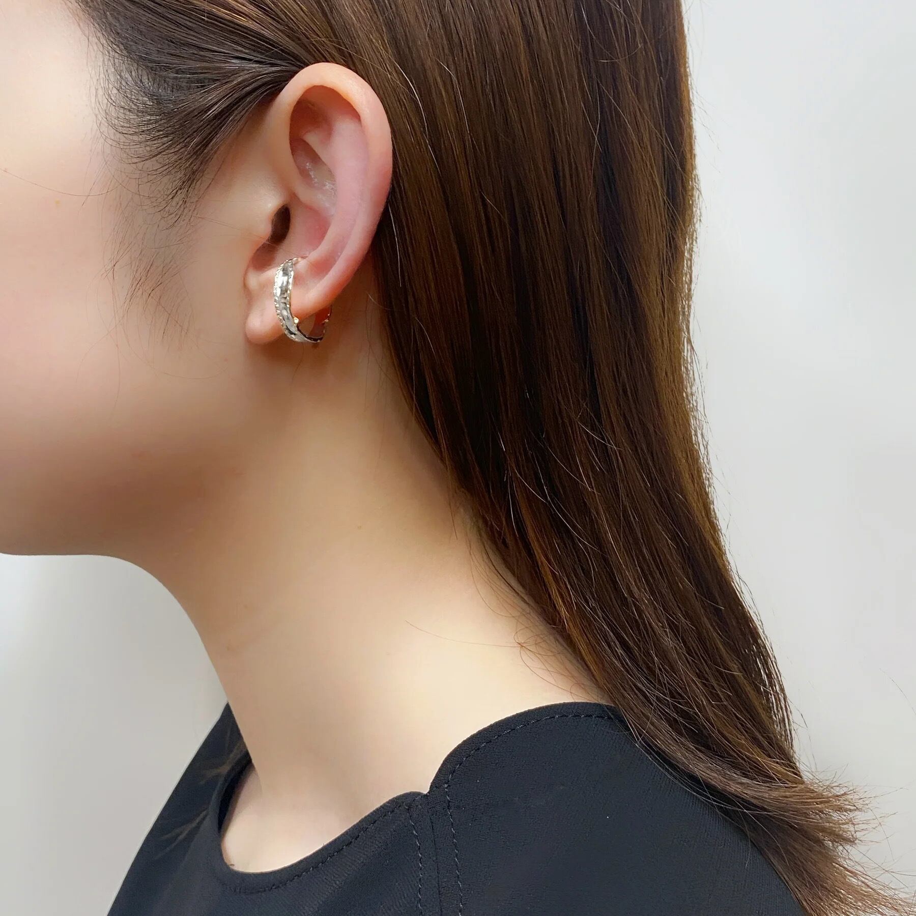 インパクトのあるイヤーカフは、着けるだけで上級者のコーディネートに。