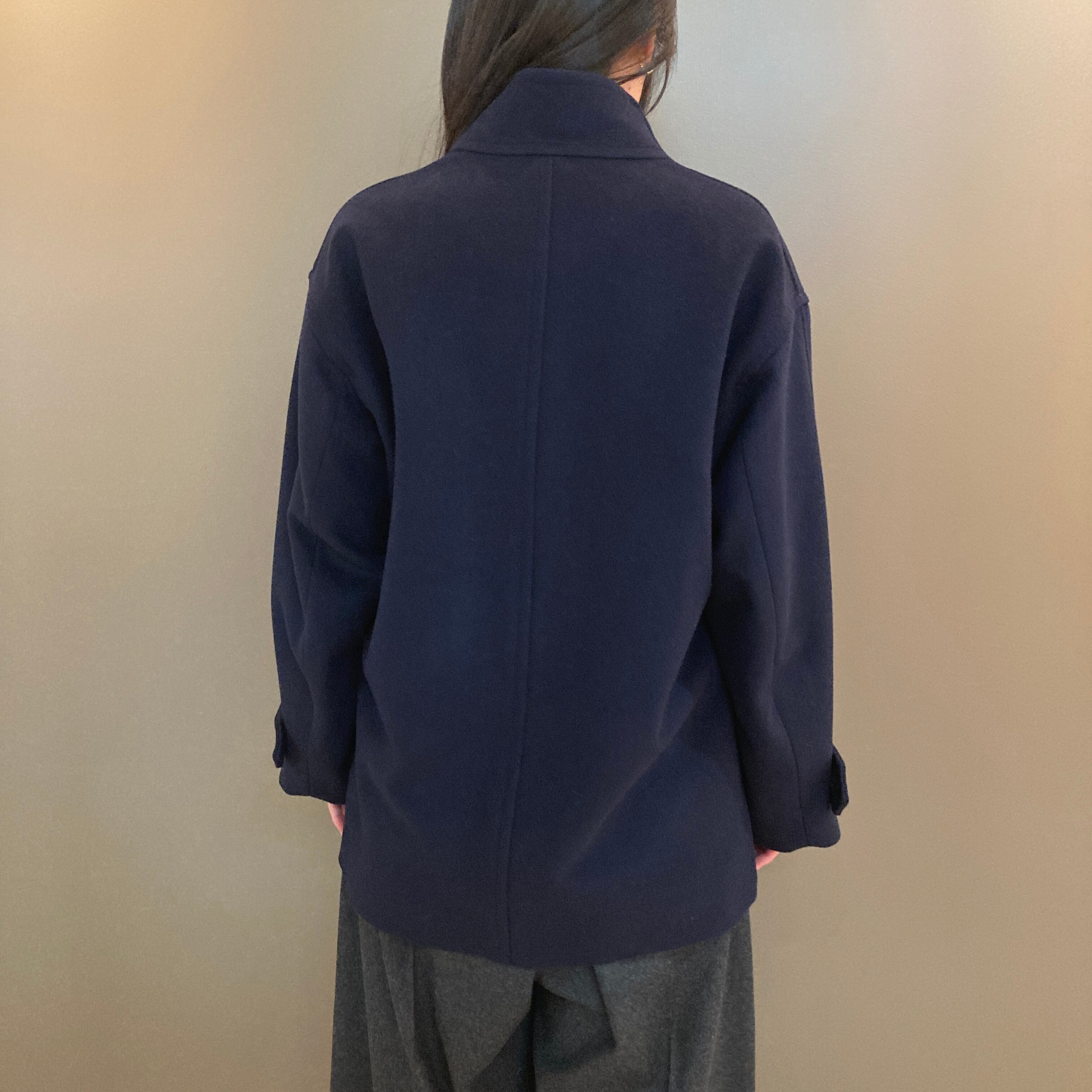 贅沢に生地量を使用し、前下がりのショールのような襟が特徴的で洗練された大人の女性の印象に。極力ディティールを削ぎ落としたミニマルなデザインが特徴。