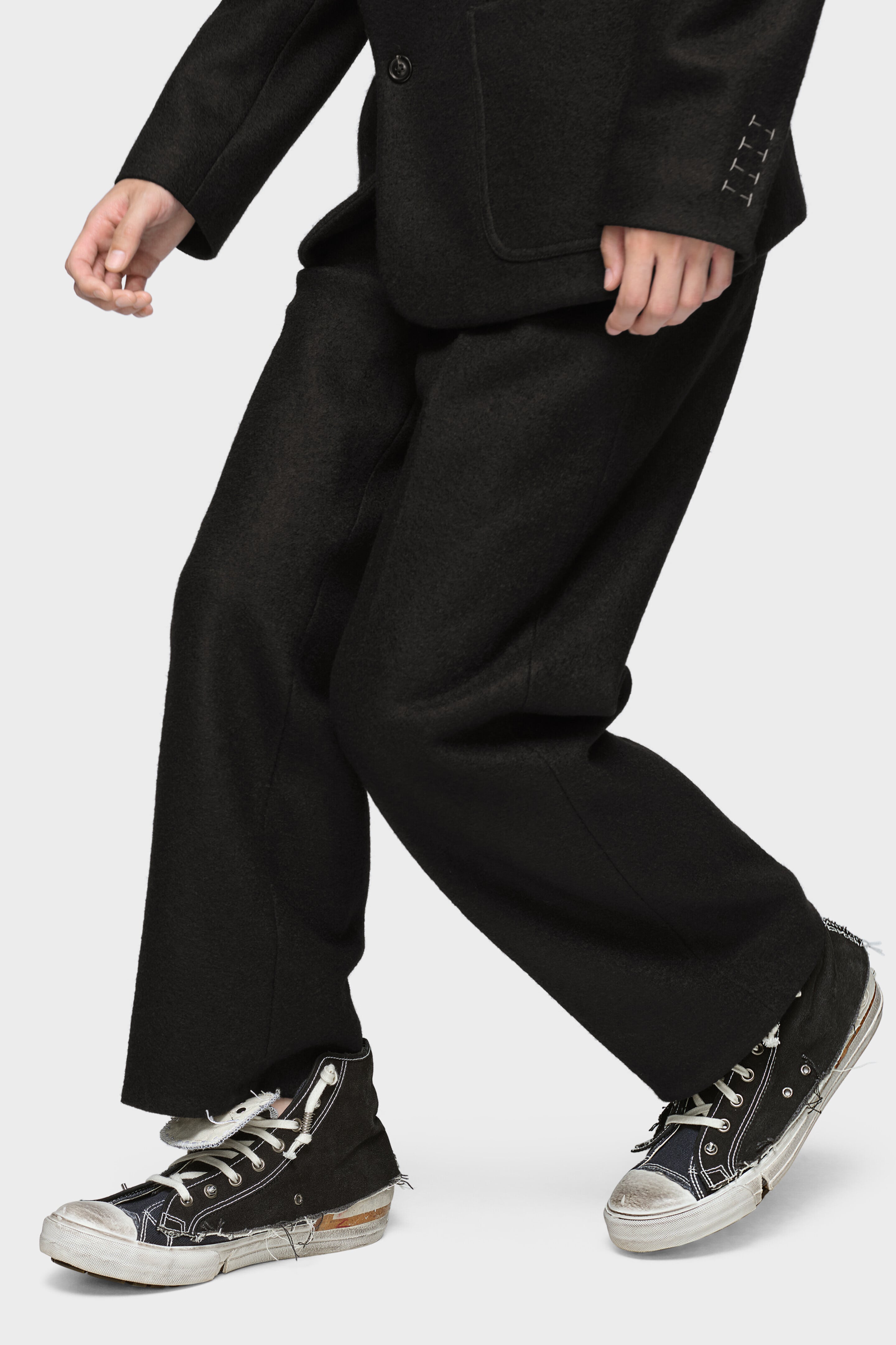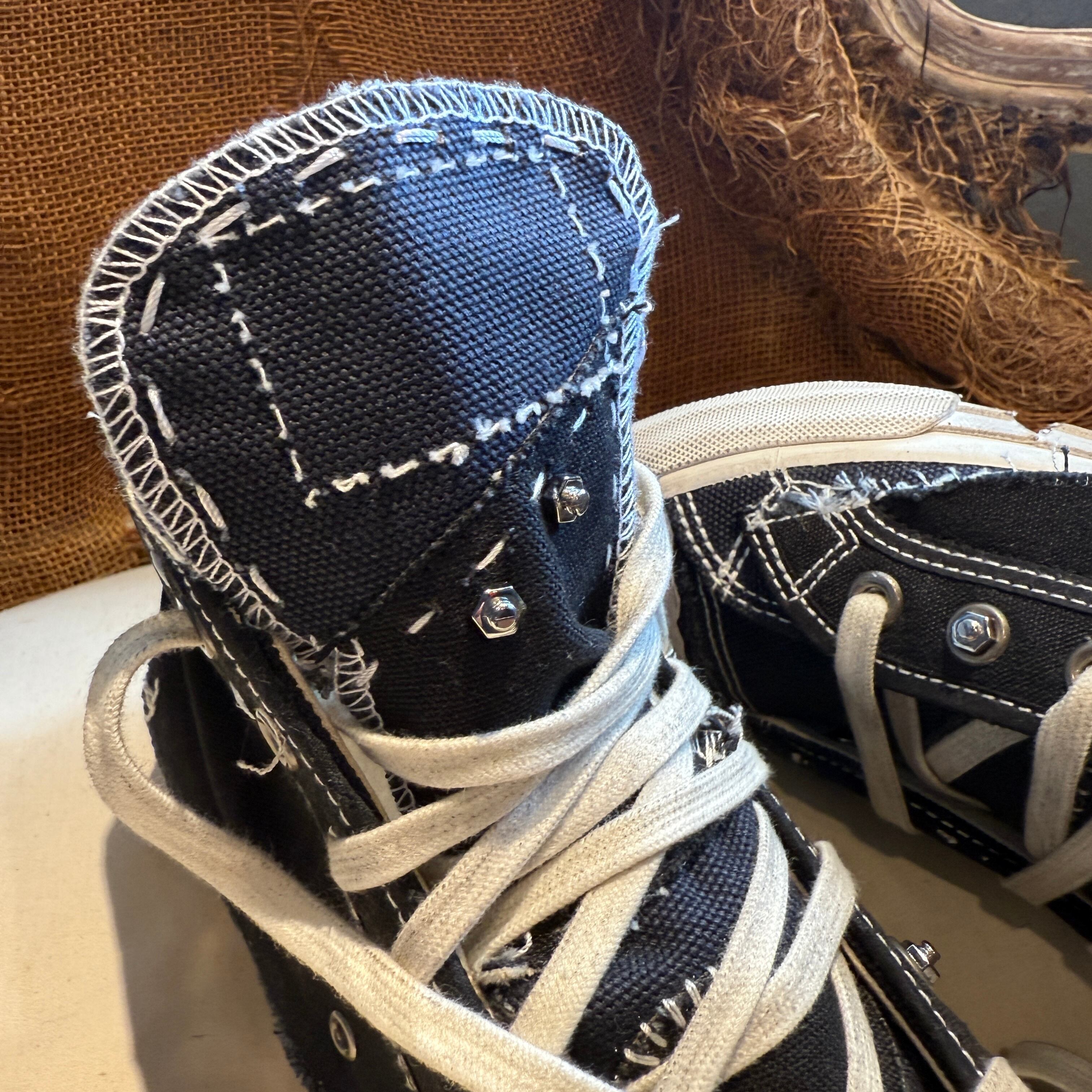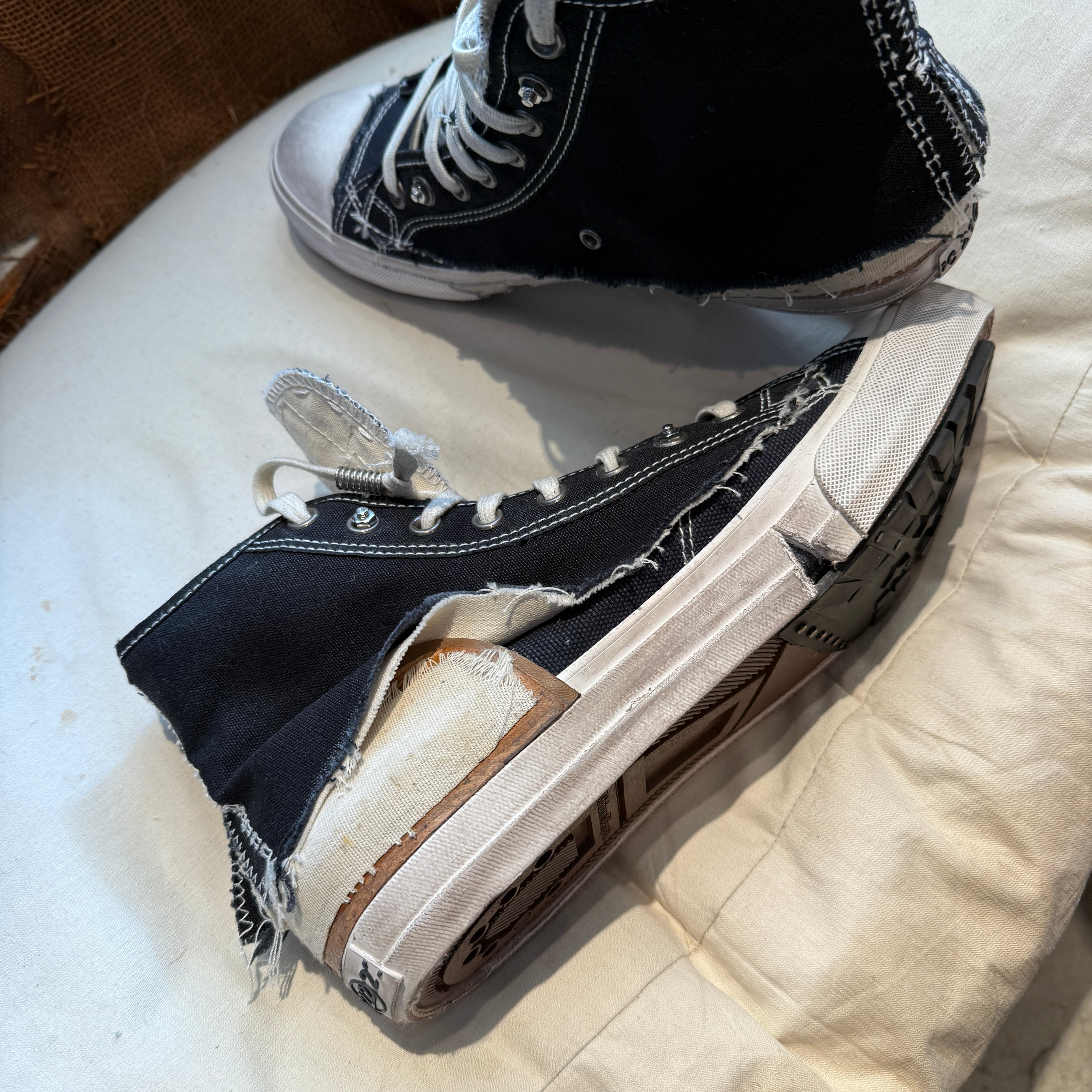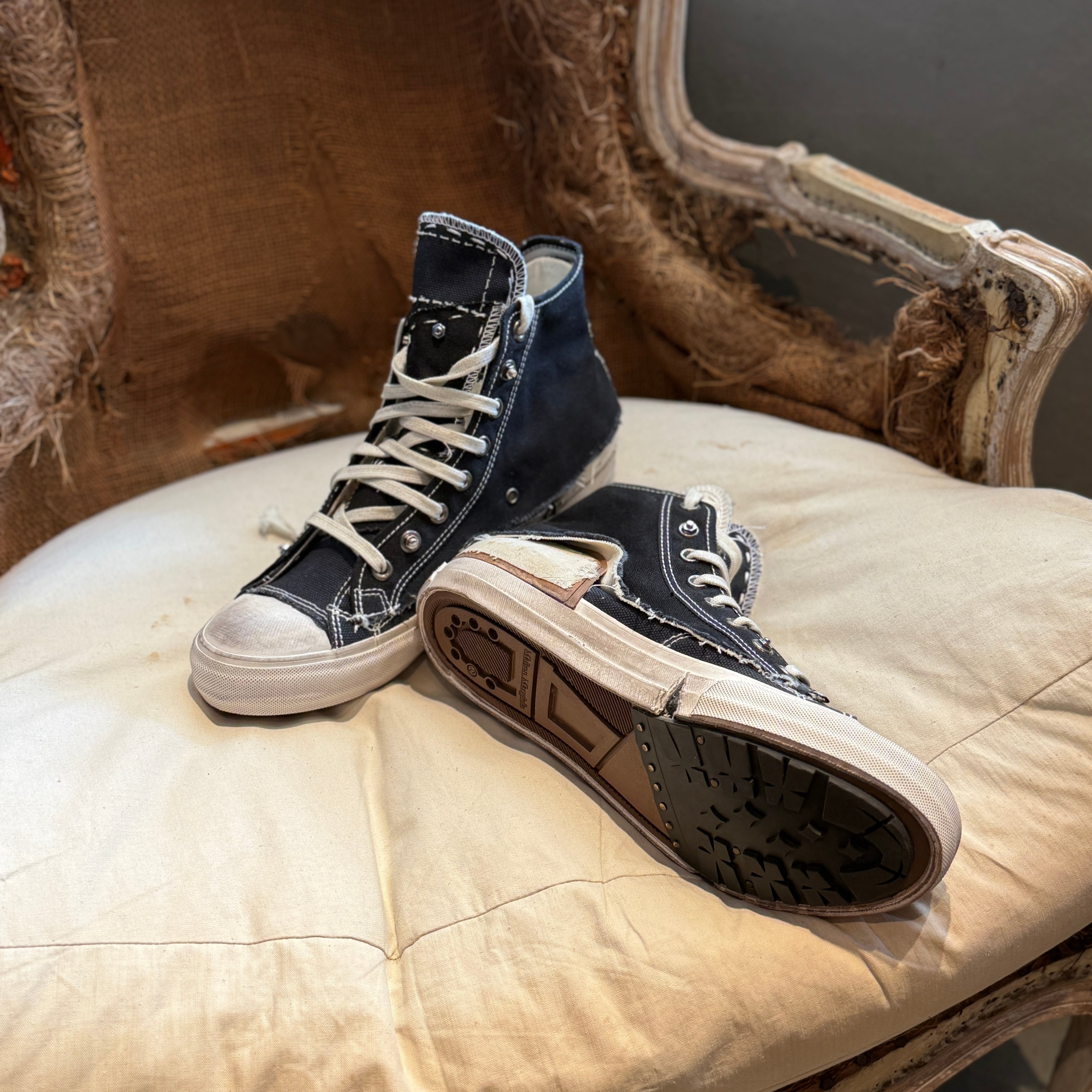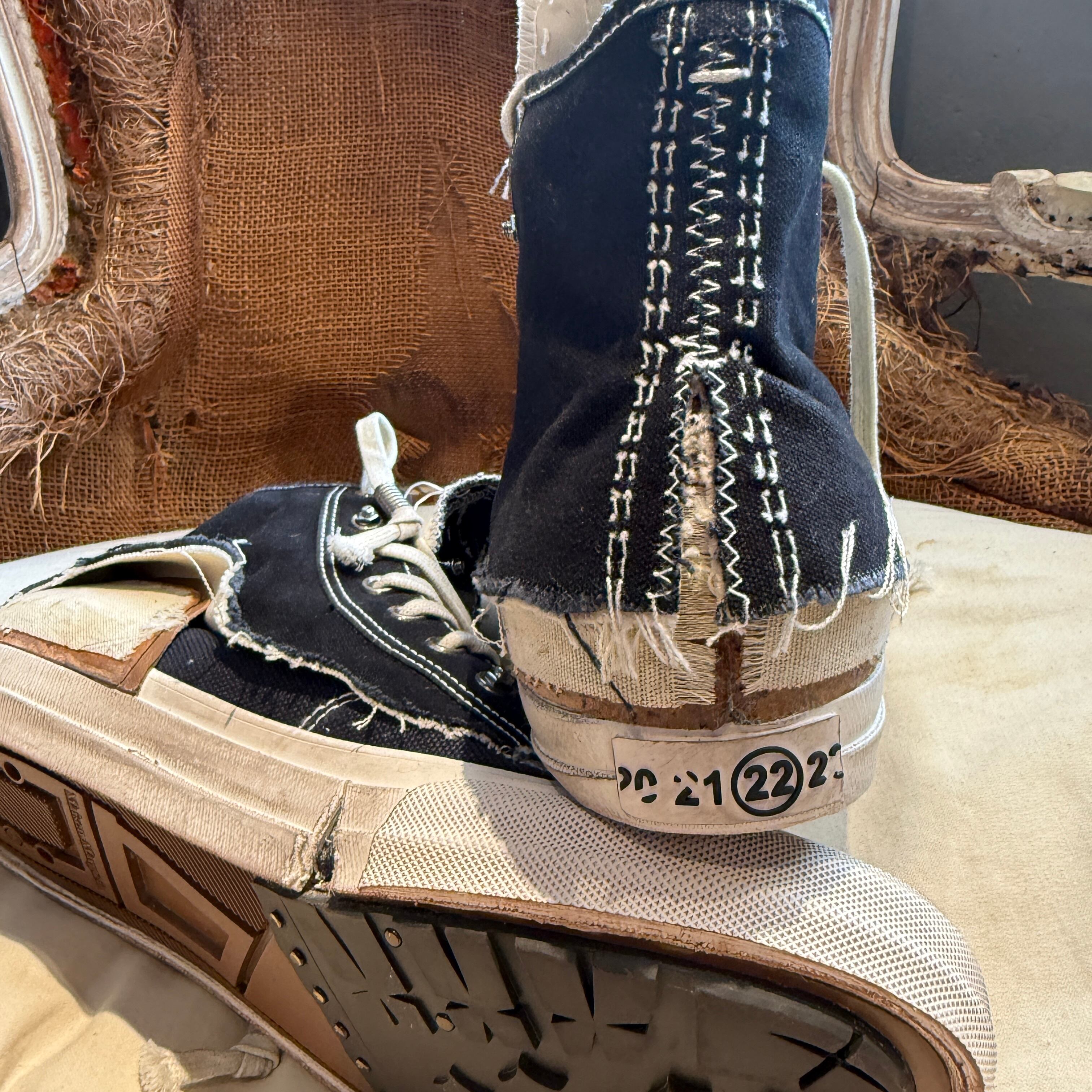 重ね合わせたキャンバスに裁ちっぱなしの縁、ディストレス加工のソール、そして露わになったシームを施したキャンバス スニーカー。履き込んだような質感を表現し、クラシックなハイトップシルエットを「歴史を内包した」佇まいにアレンジしています。