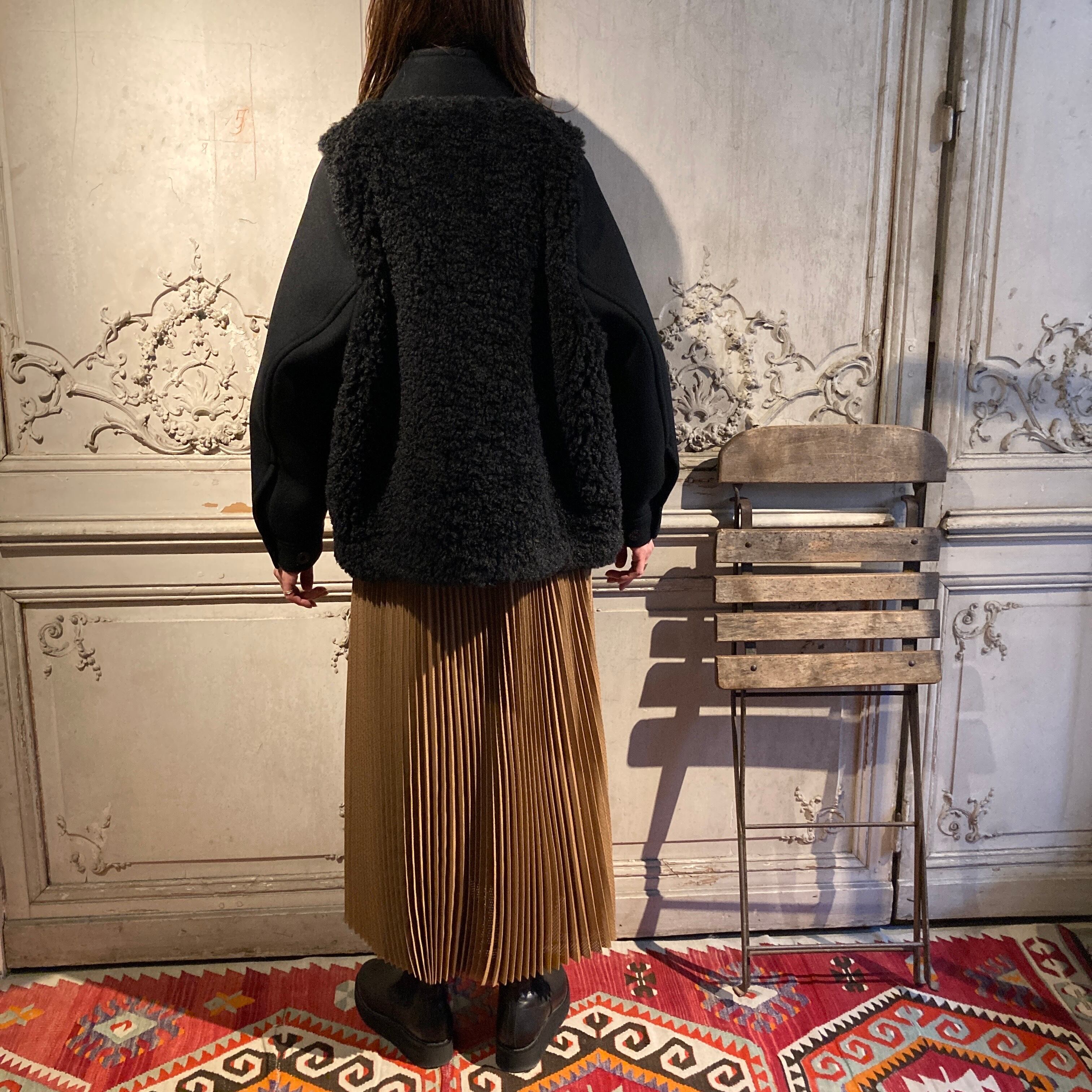 暖かく、肌触りの良い柔らかい表情のウール素材と艶のあるポリエステルファーとの異素材の組み合わせがモードな雰囲気を演出しています。