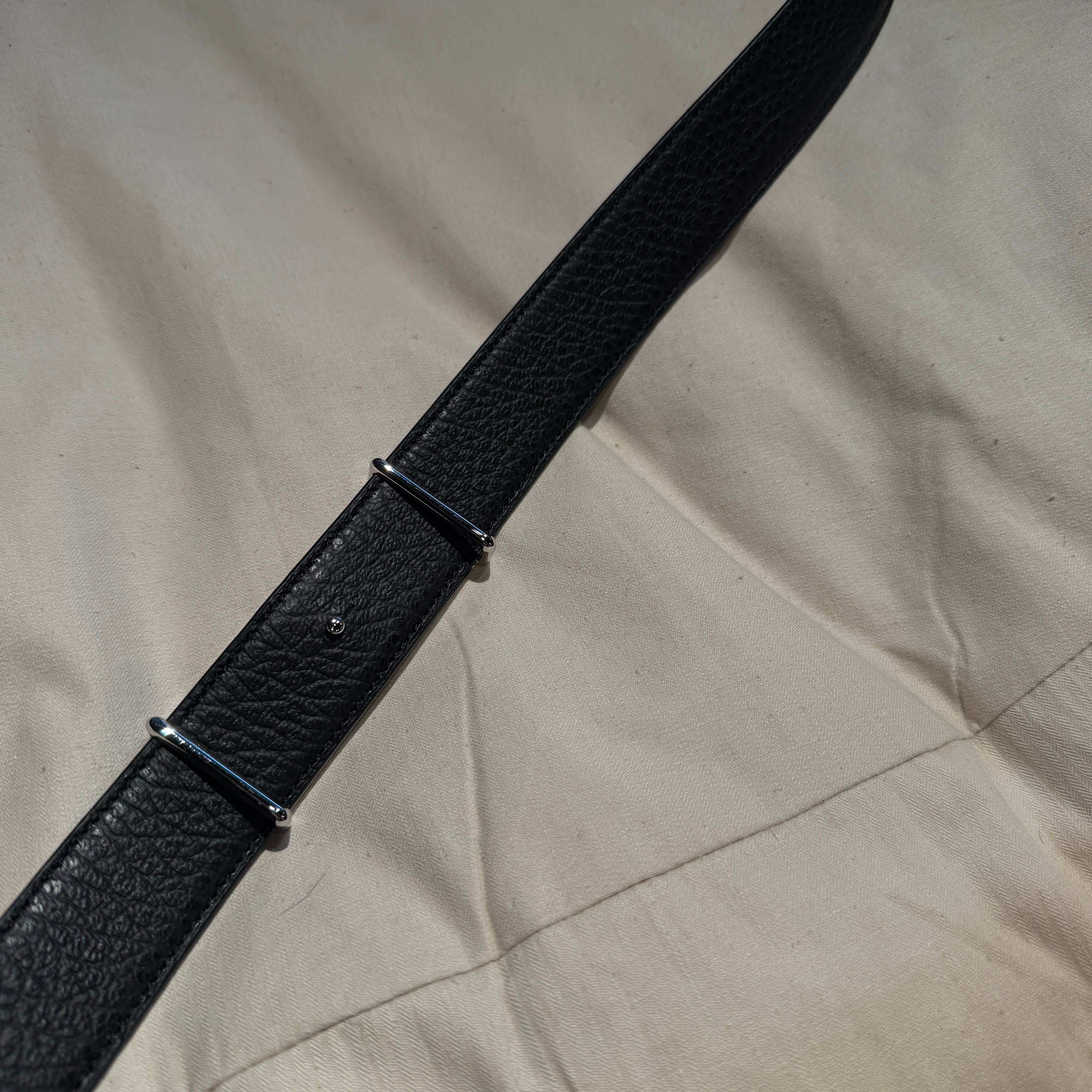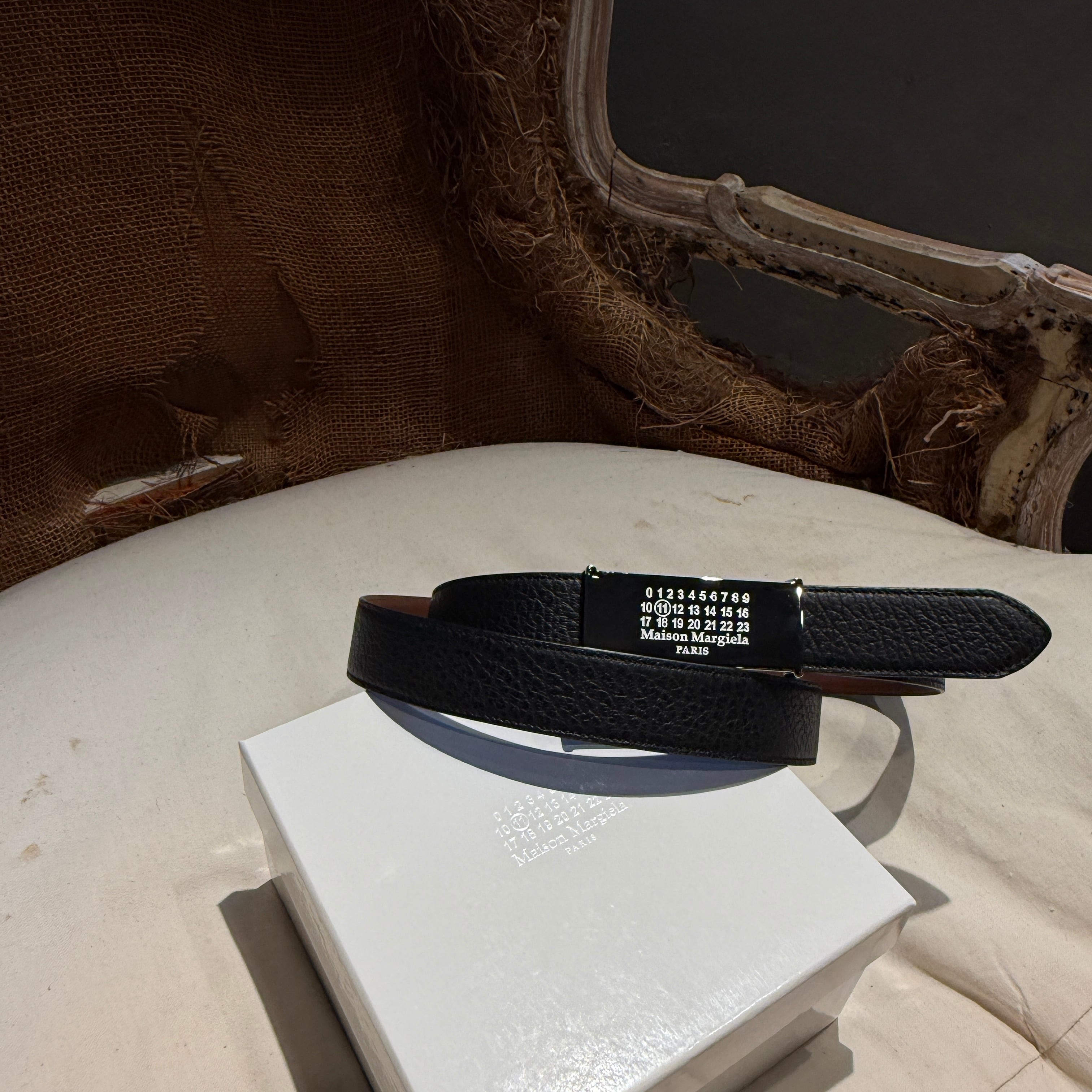 メタルバックルにメゾン マルジェラのシグネチャーであるカレンダーロゴがが施されたリバーシブルベルトです。バックル裏のピンにより着脱し、カラーを変えることができます。表と裏で素材の加工が異なり、加工の変化も楽しむことができます。