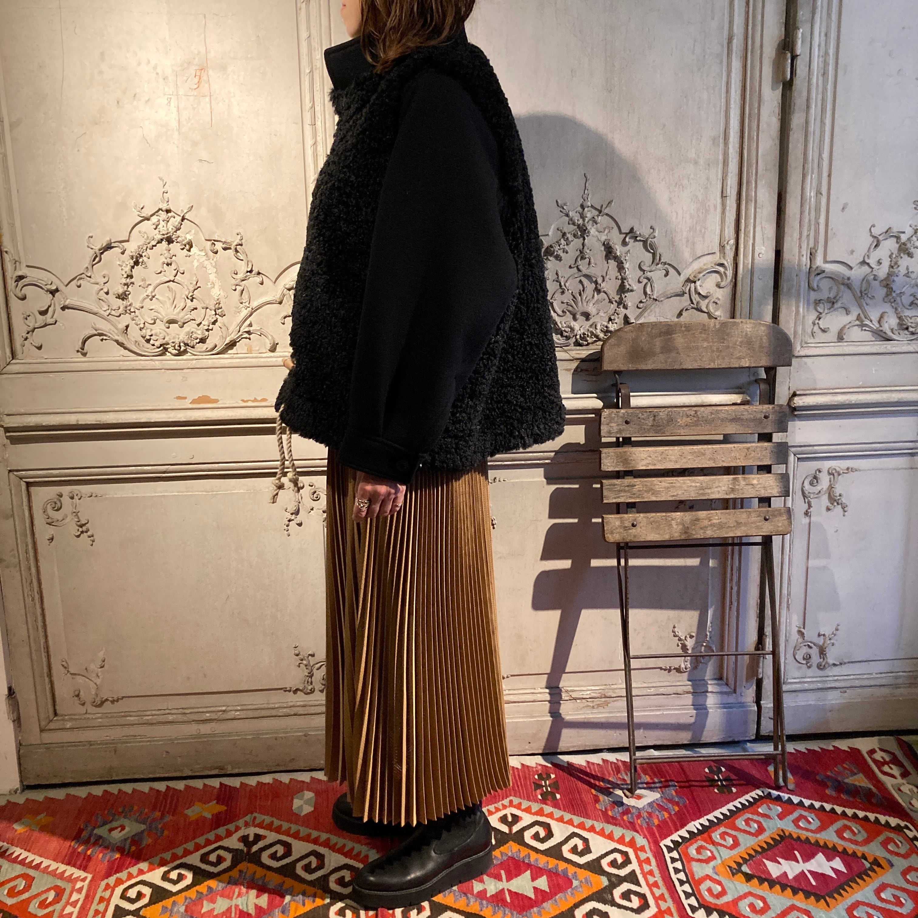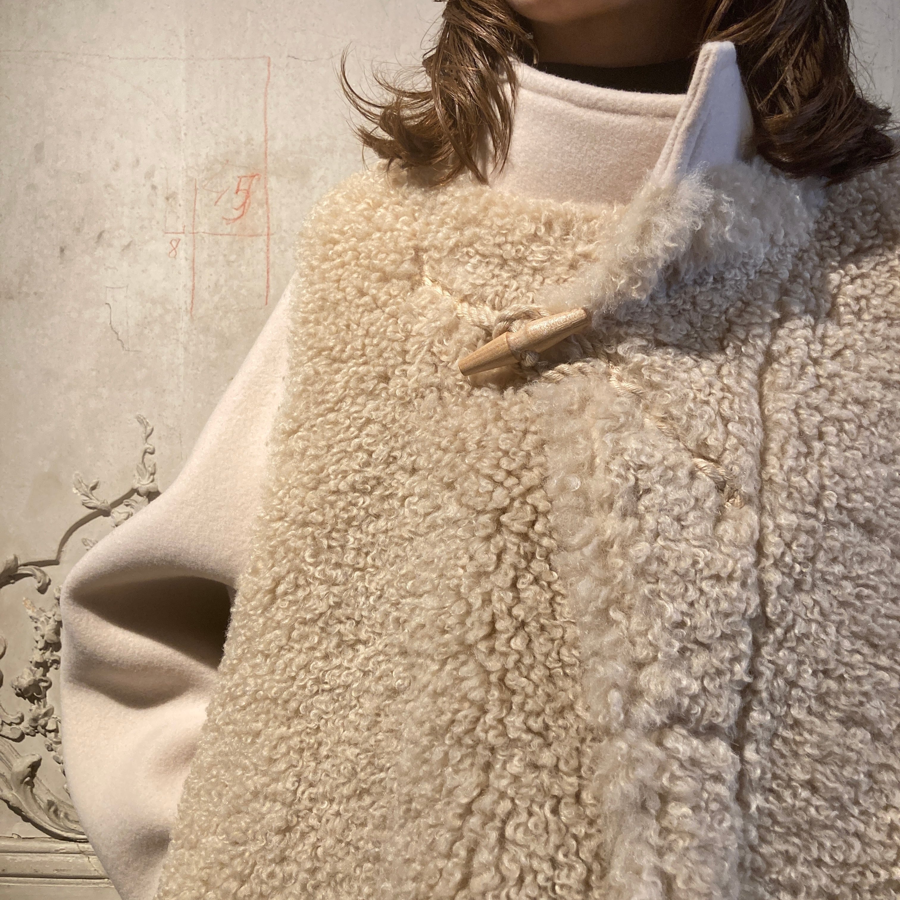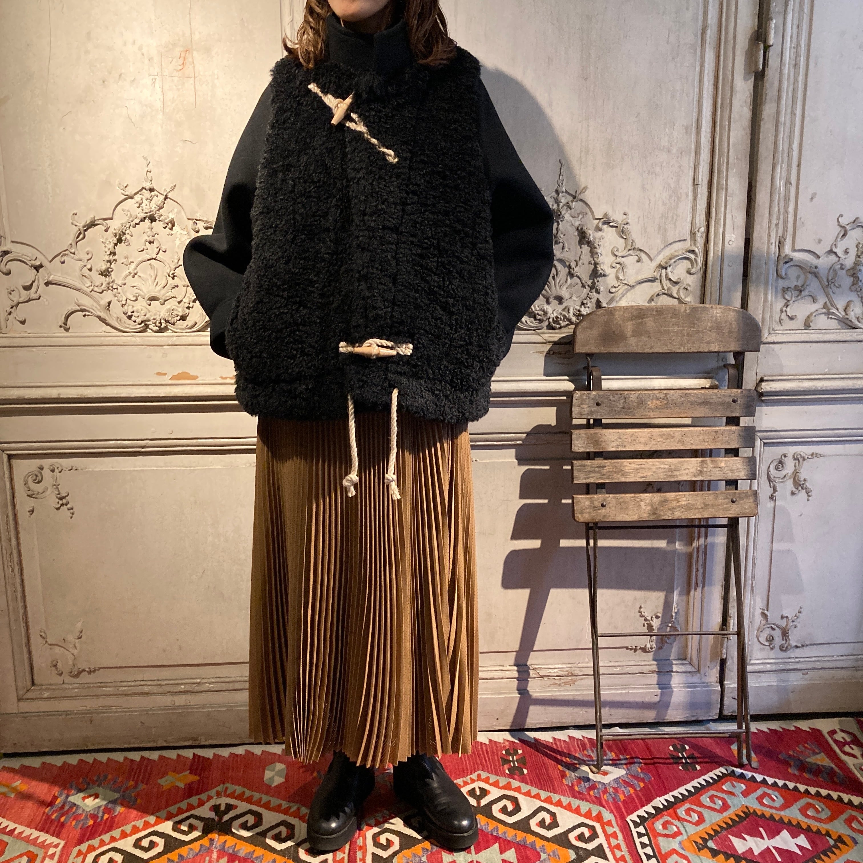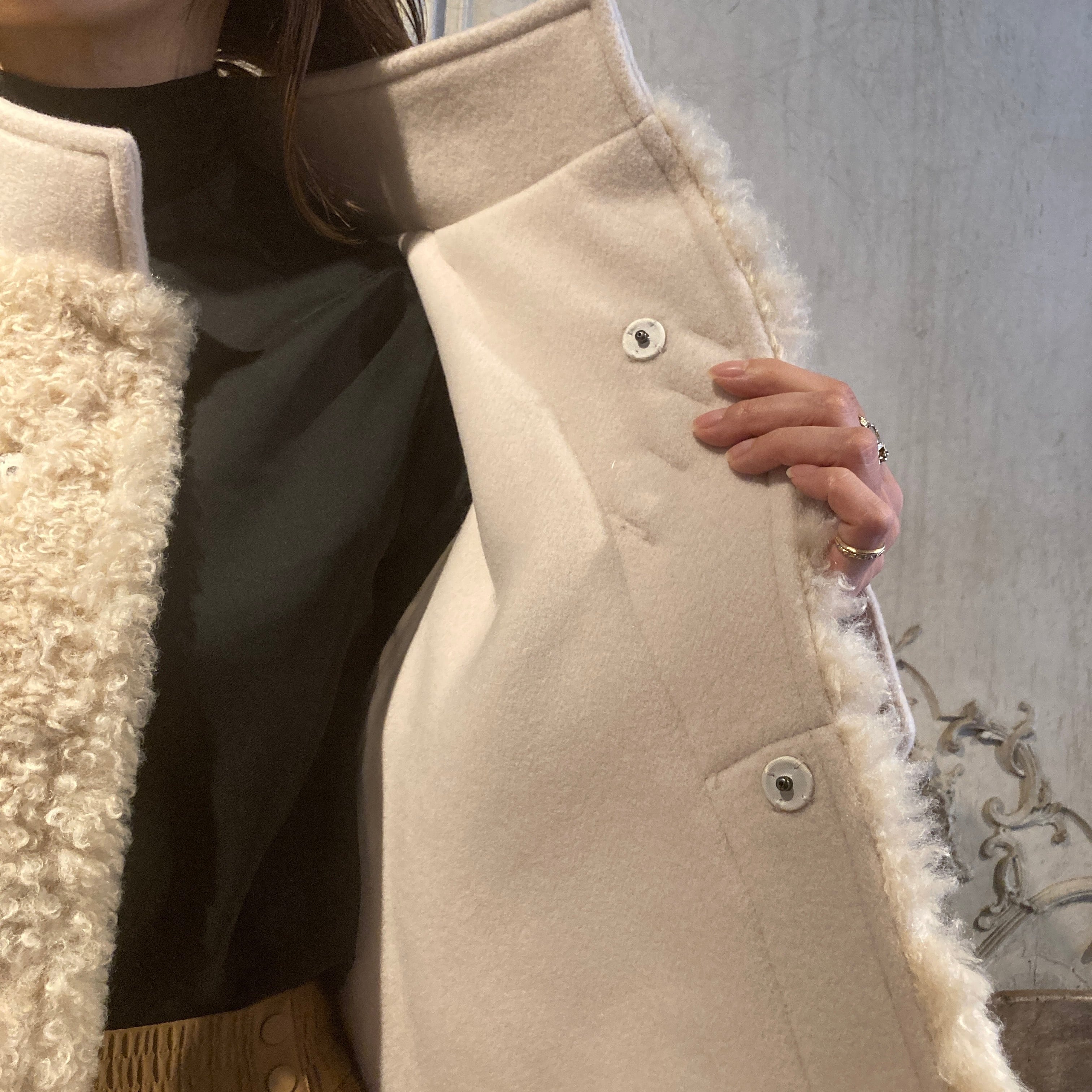 暖かく、肌触りの良い柔らかい表情のウール素材と艶のあるポリエステルファーとの異素材の組み合わせがモードな雰囲気を演出しています。