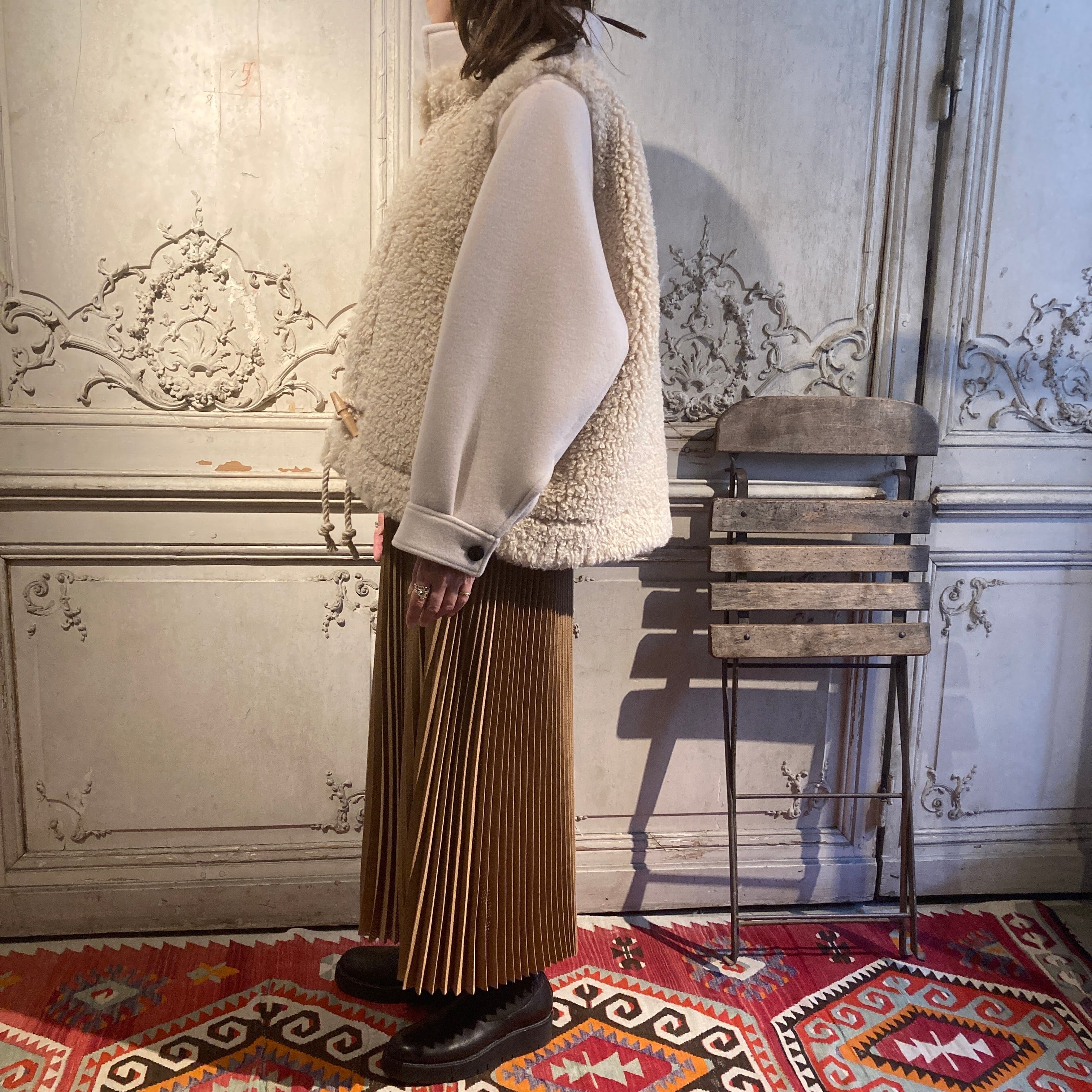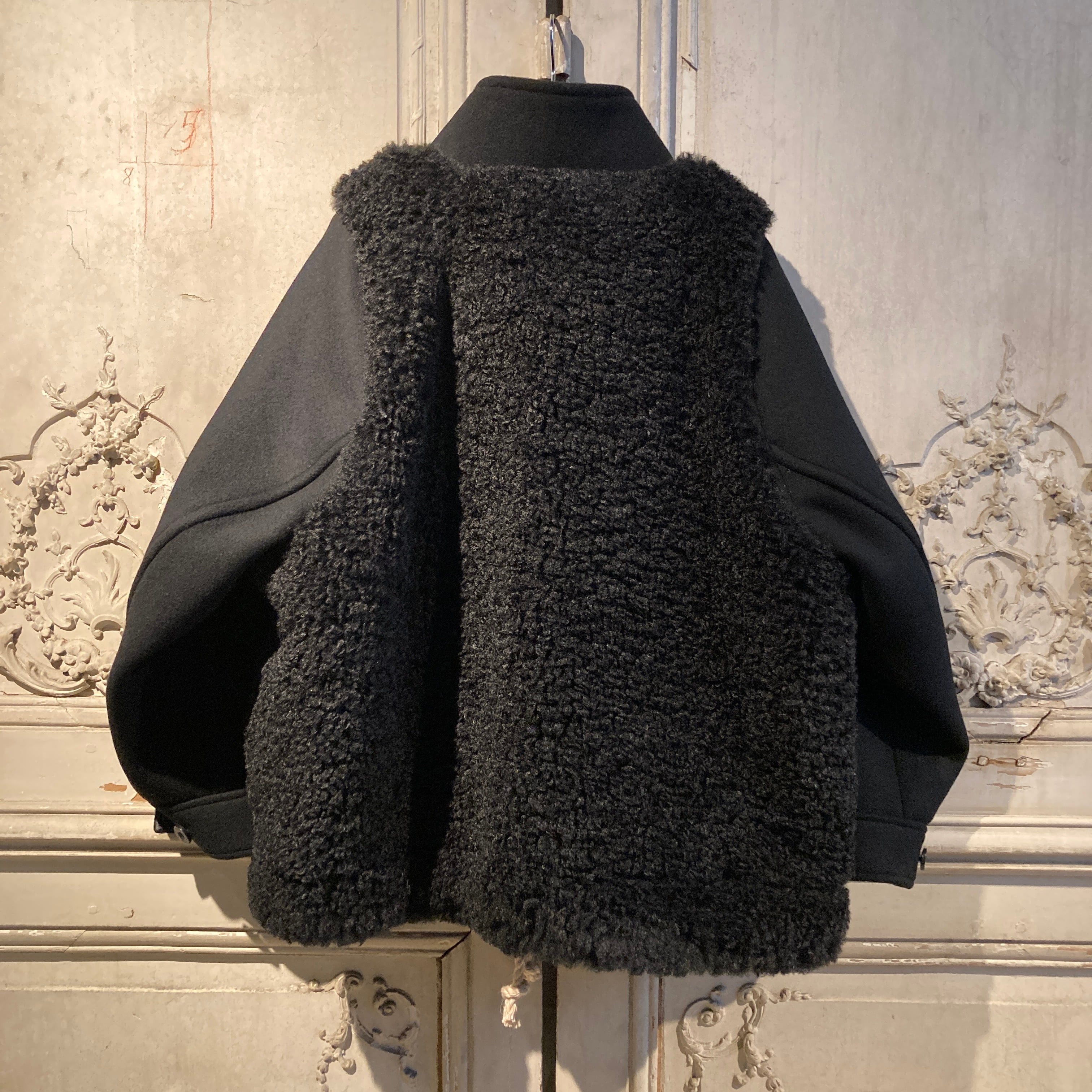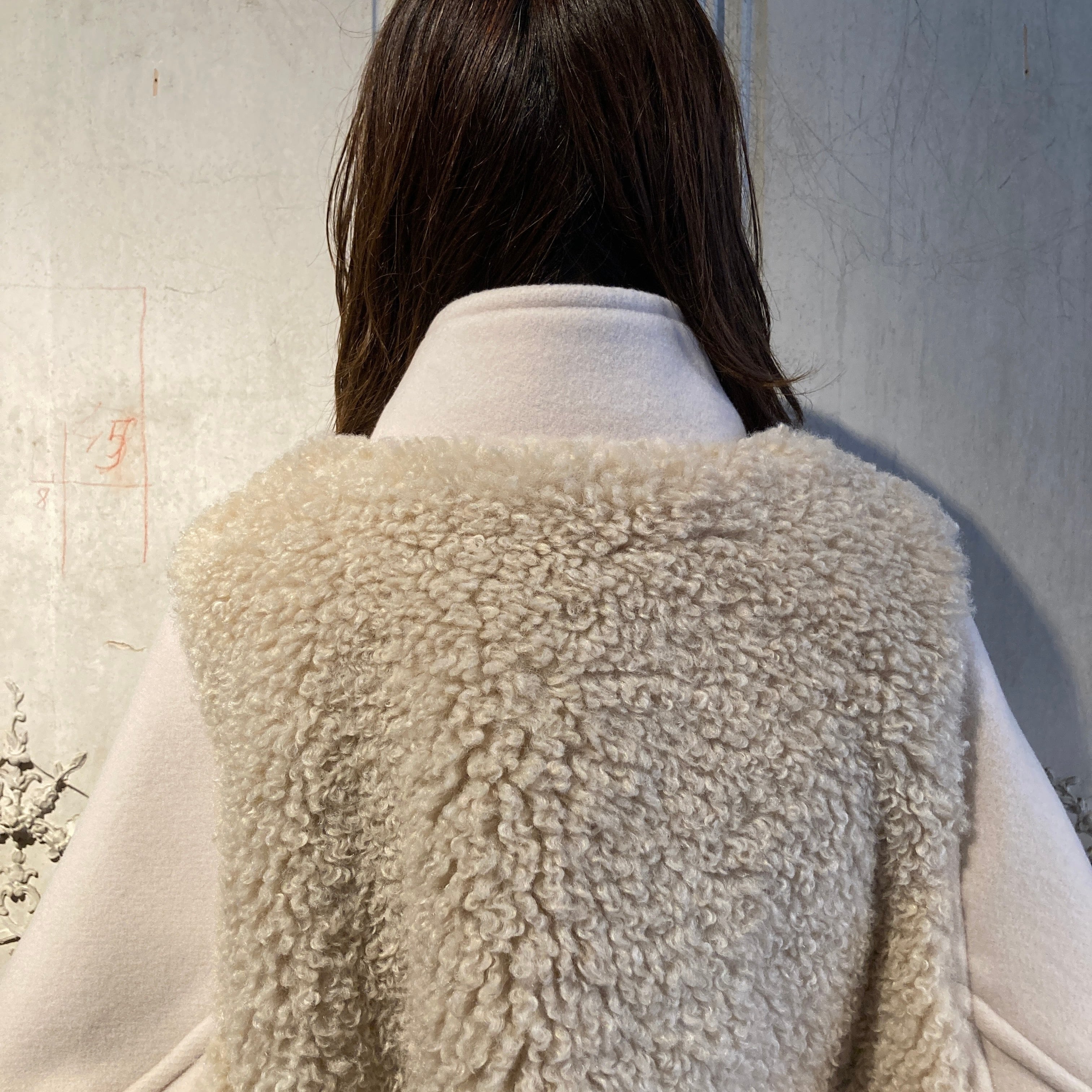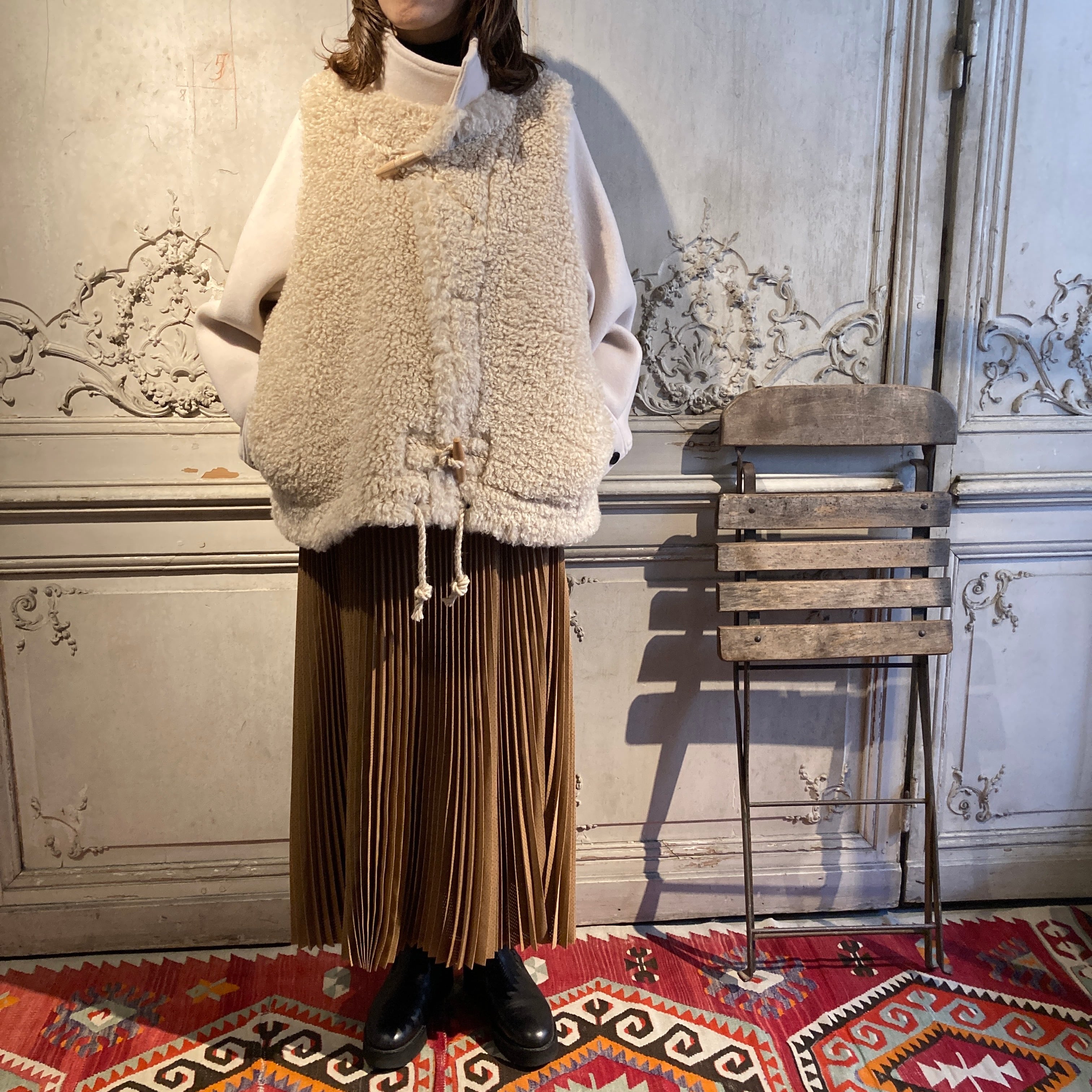 暖かく、肌触りの良い柔らかい表情のウール素材と艶のあるポリエステルファーとの異素材の組み合わせがモードな雰囲気を演出しています。