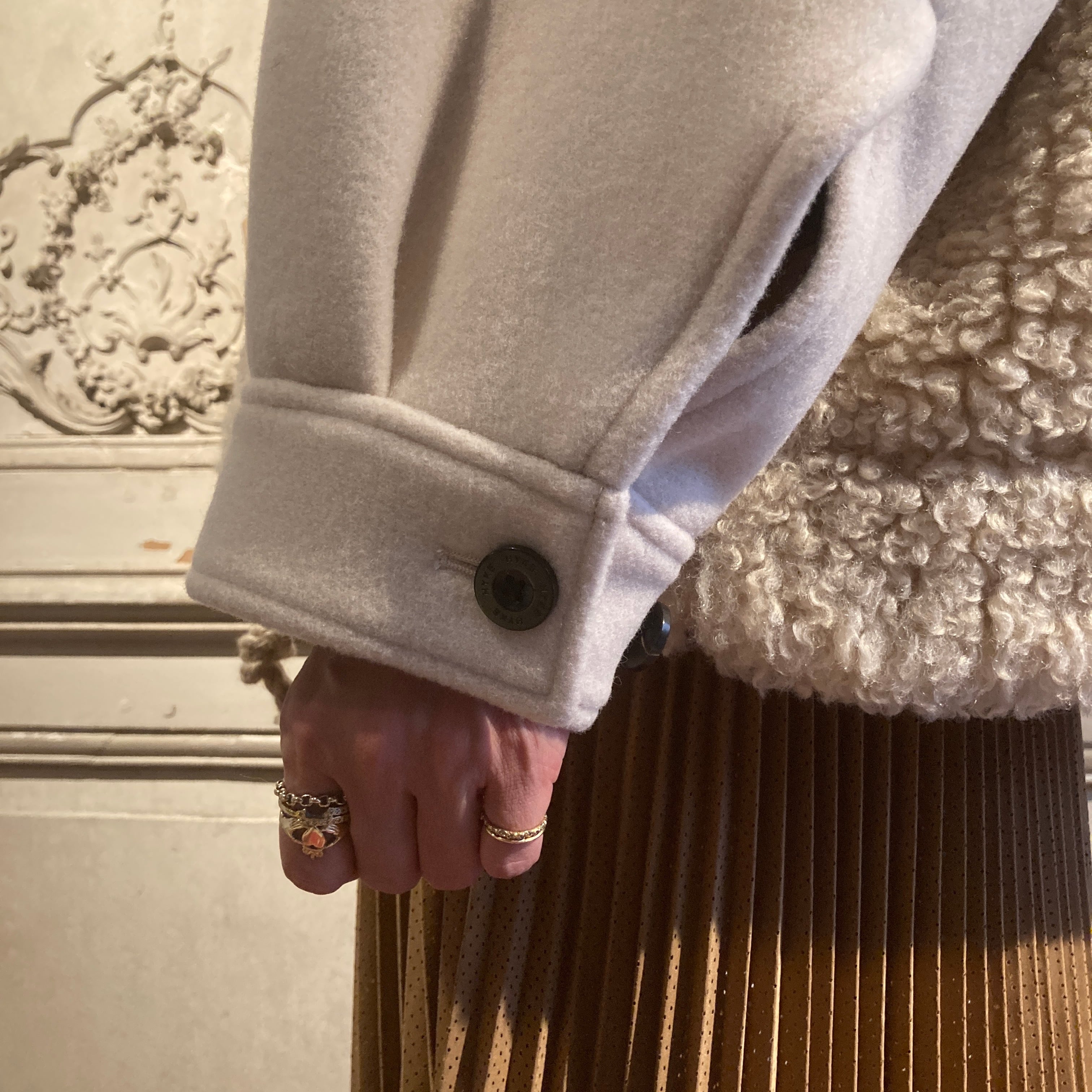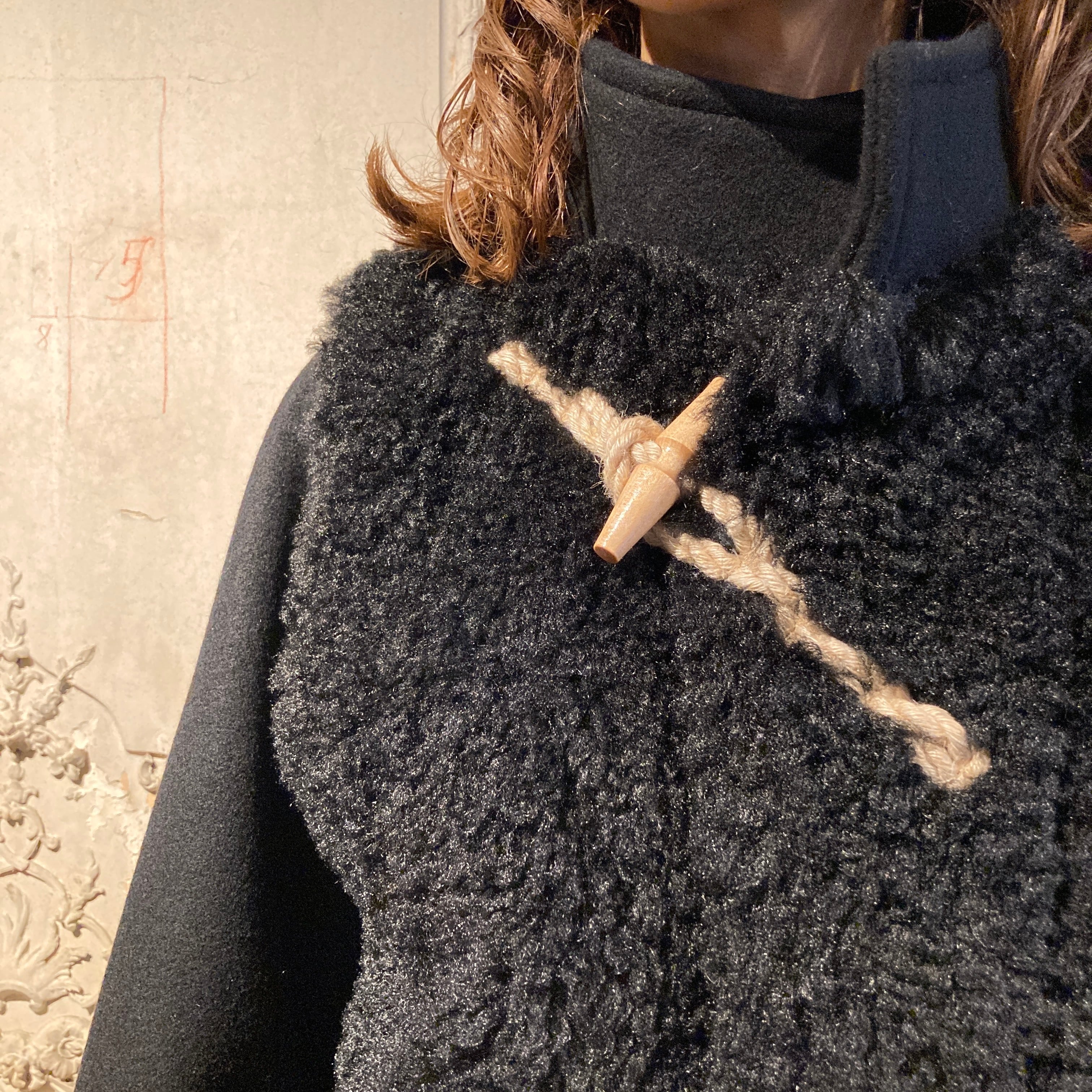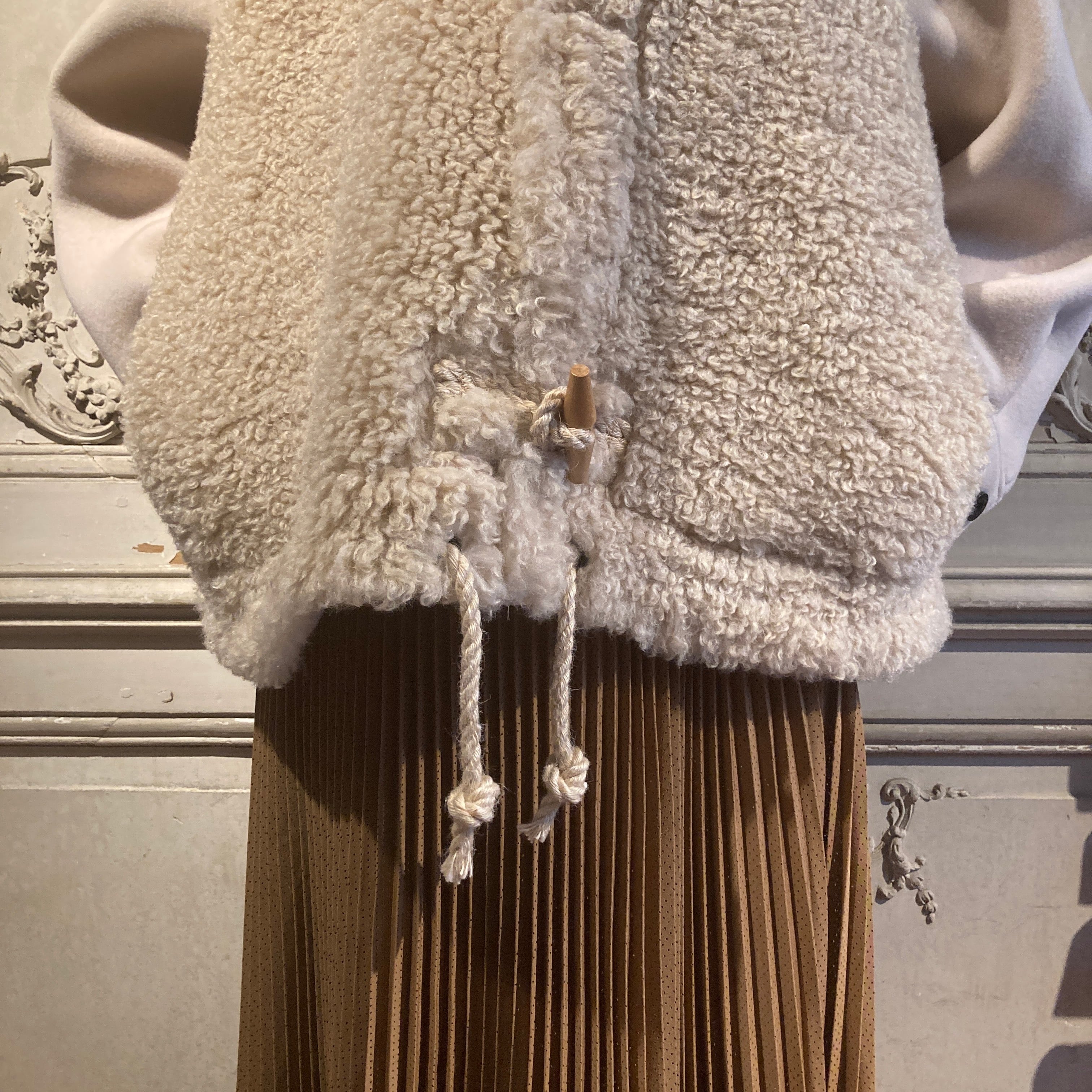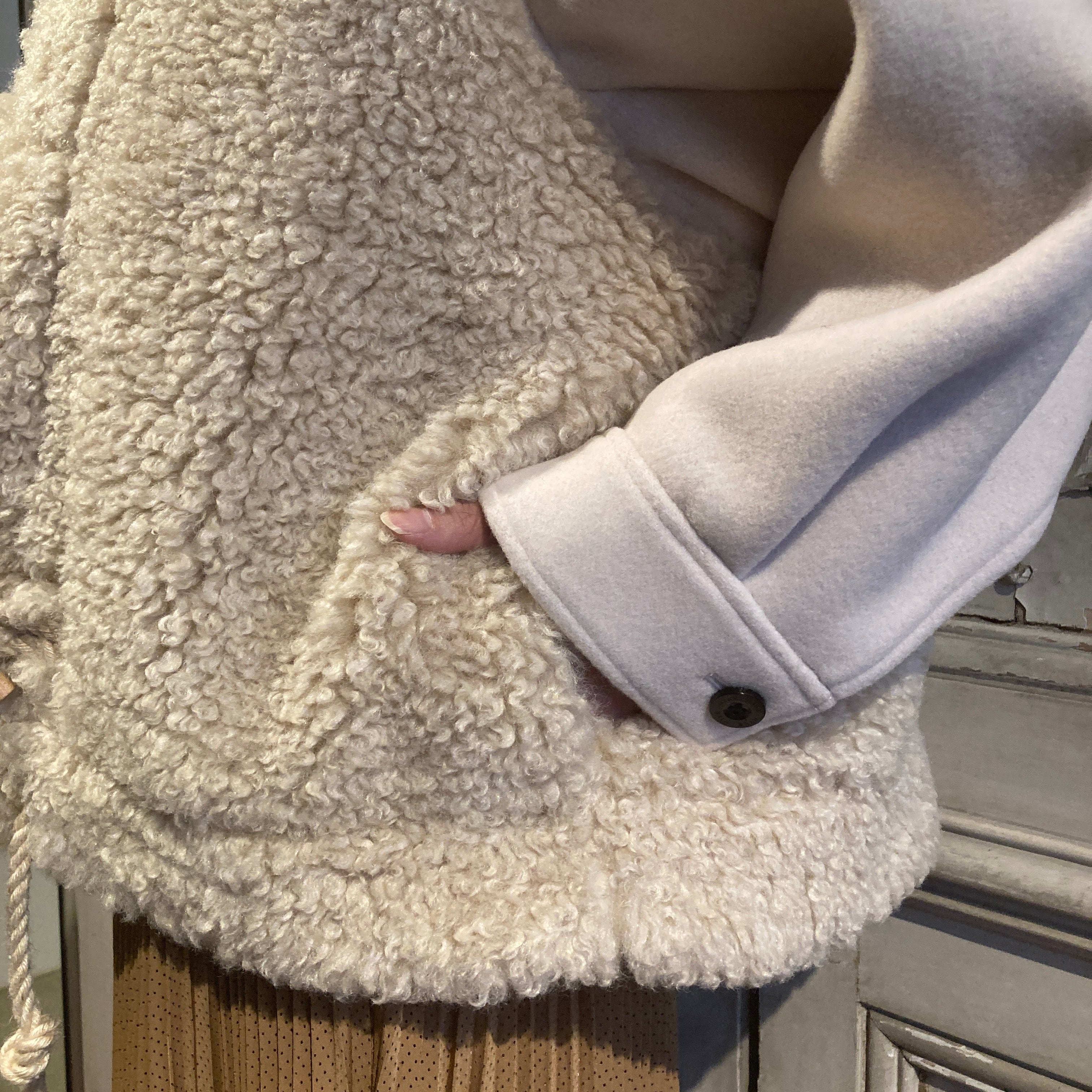 暖かく、肌触りの良い柔らかい表情のウール素材と艶のあるポリエステルファーとの異素材の組み合わせがモードな雰囲気を演出しています。