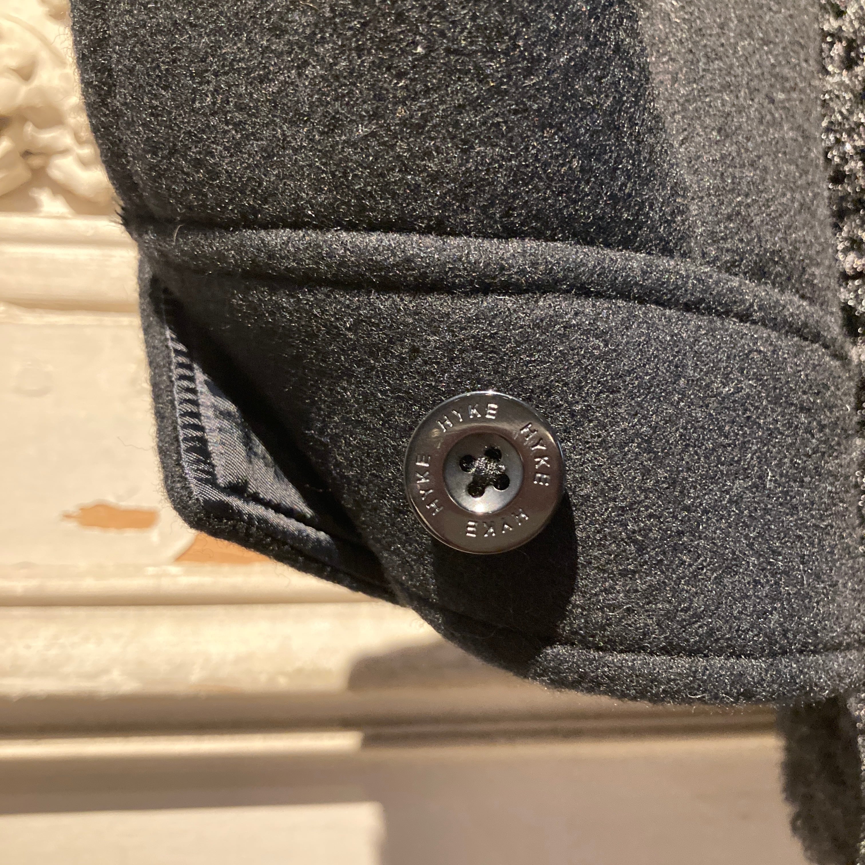 HYKE人気のダブルフェイスの起毛生地を使用したファータイプのダッフルジャケット。