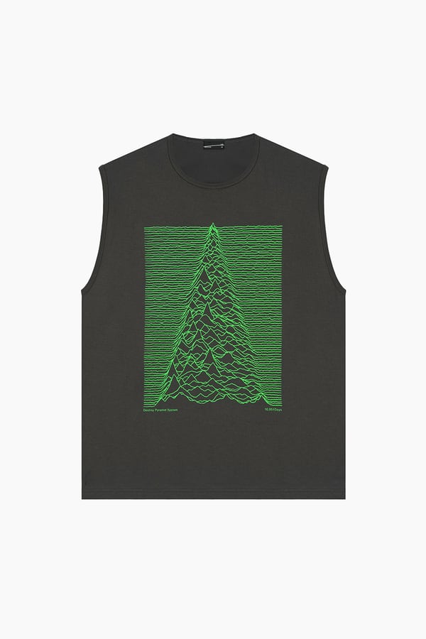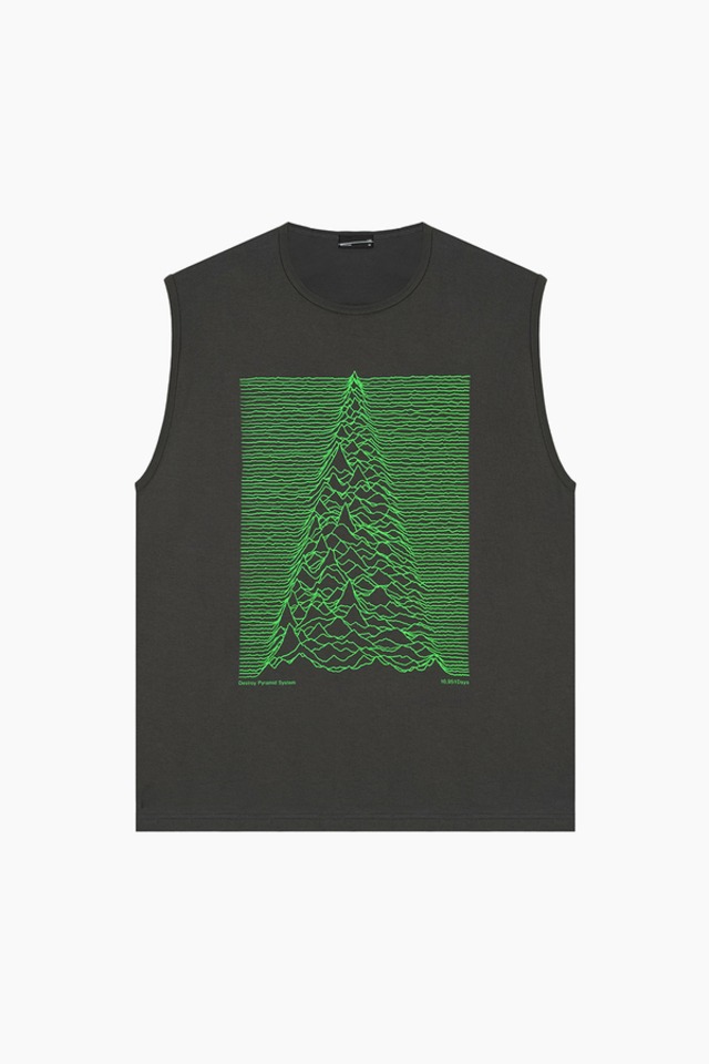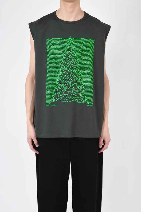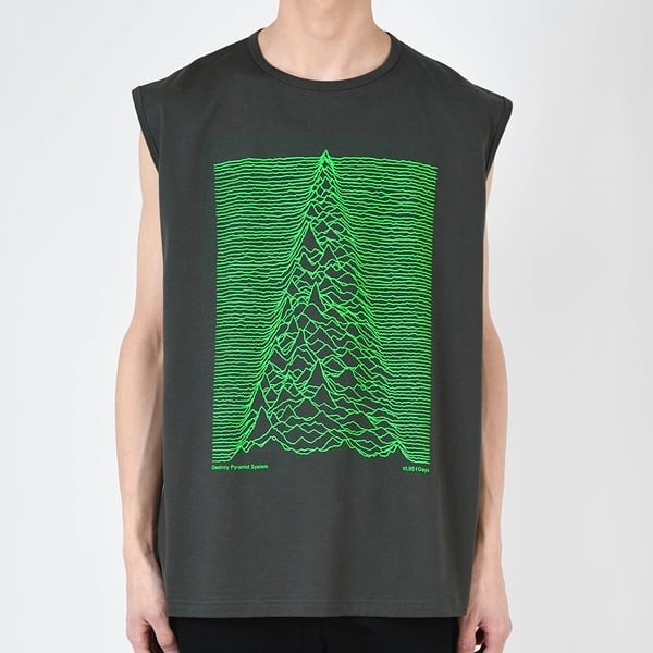 過去のグラフィックをリバイバルしたデザインでピラミッド型に浮かび上がる波形図柄をプリントしています。