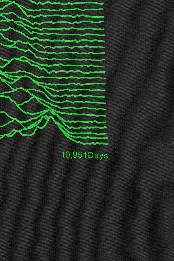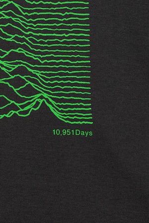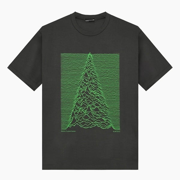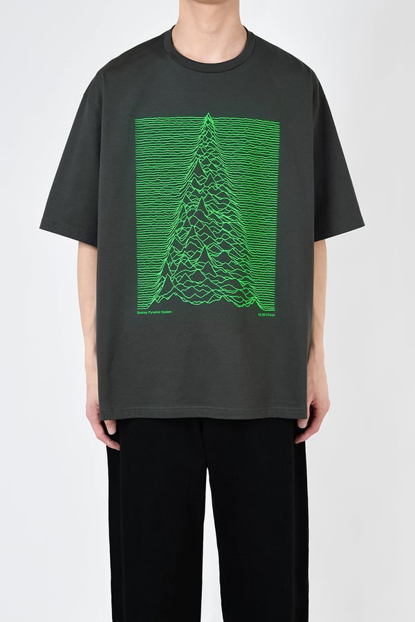 過去のグラフィックをリバイバルしたデザインでピラミッド型に浮かび上がる波形図柄をプリントしています。