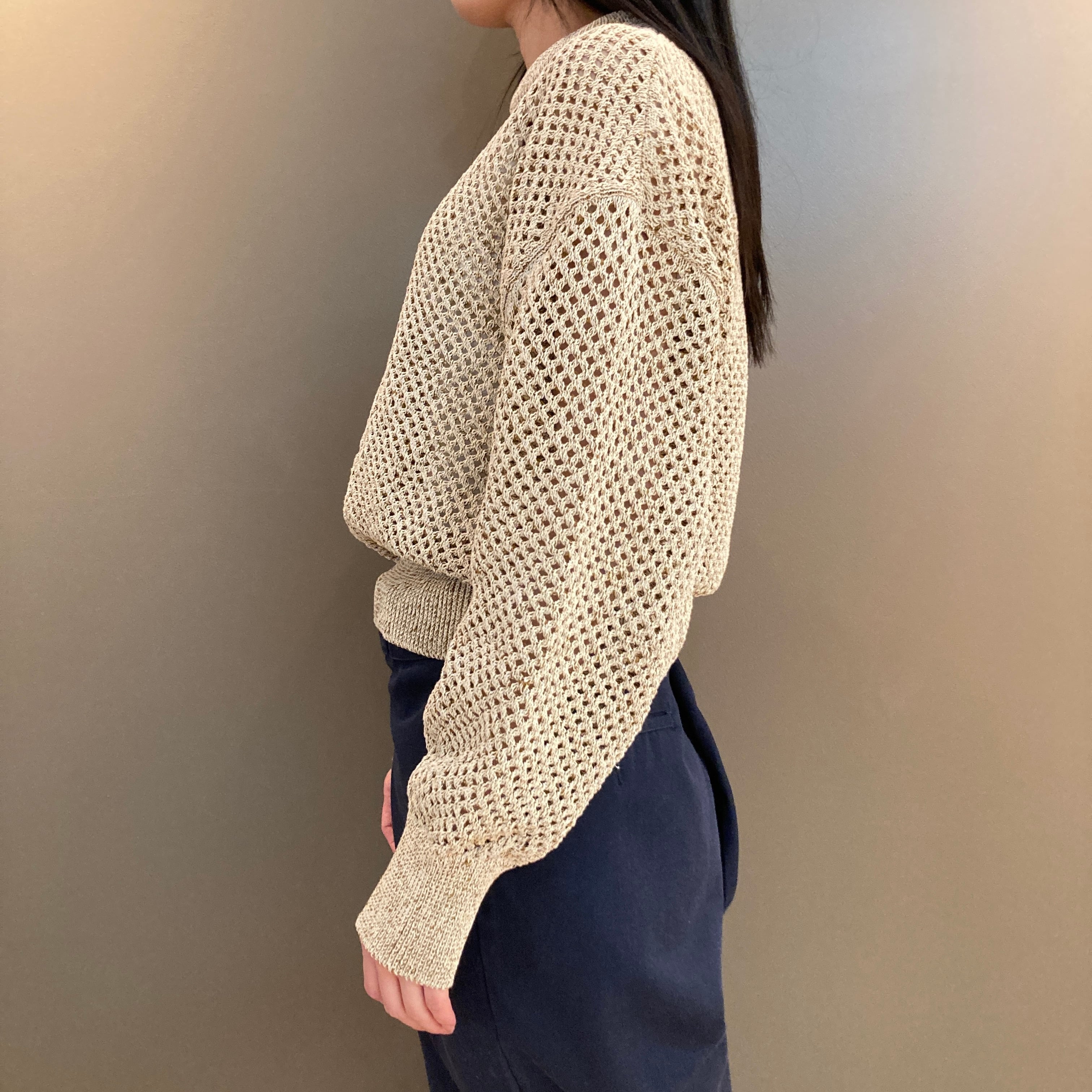 今年トレンドの透け感のある編み地が特徴で、シアーな素材感とレイヤードをお楽しみ下さい。