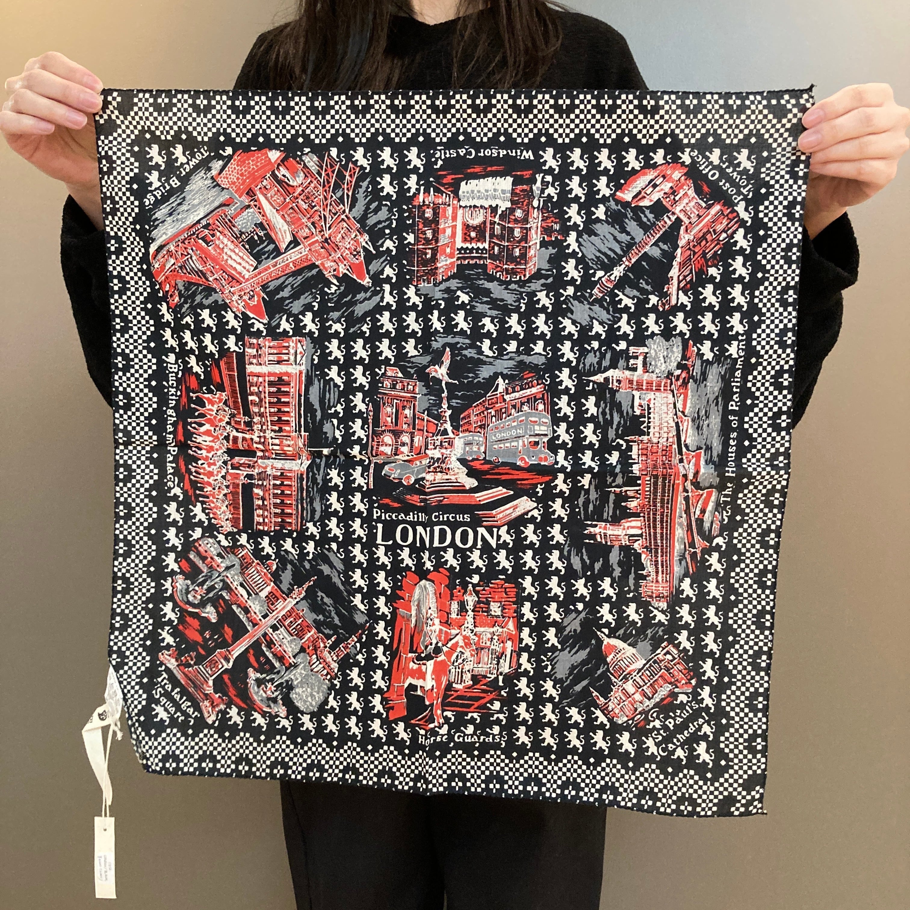 バックにチェッカーとライオンをあしらったスーべニールなロンドンのヴィンテージ風マッププリントのバンダナ。