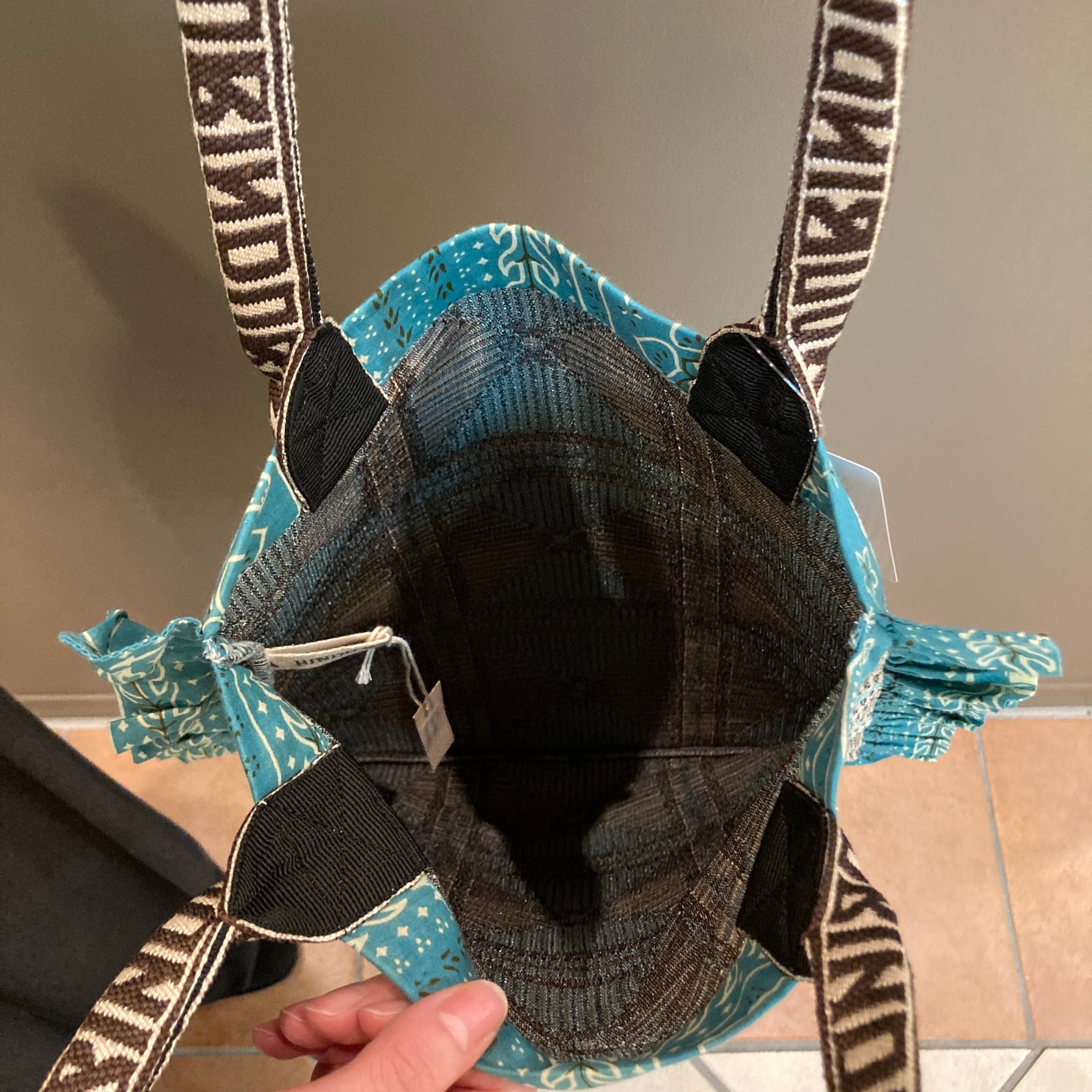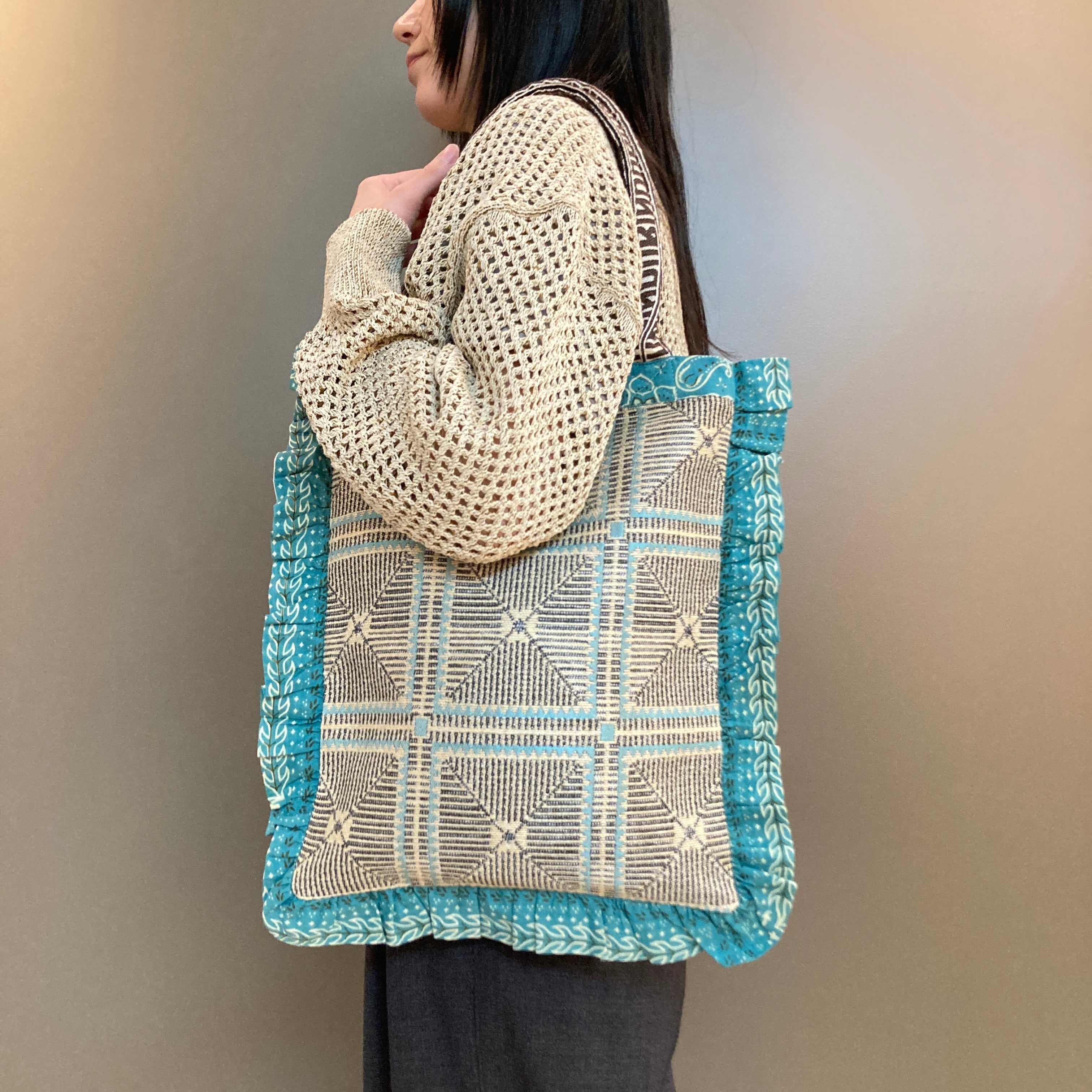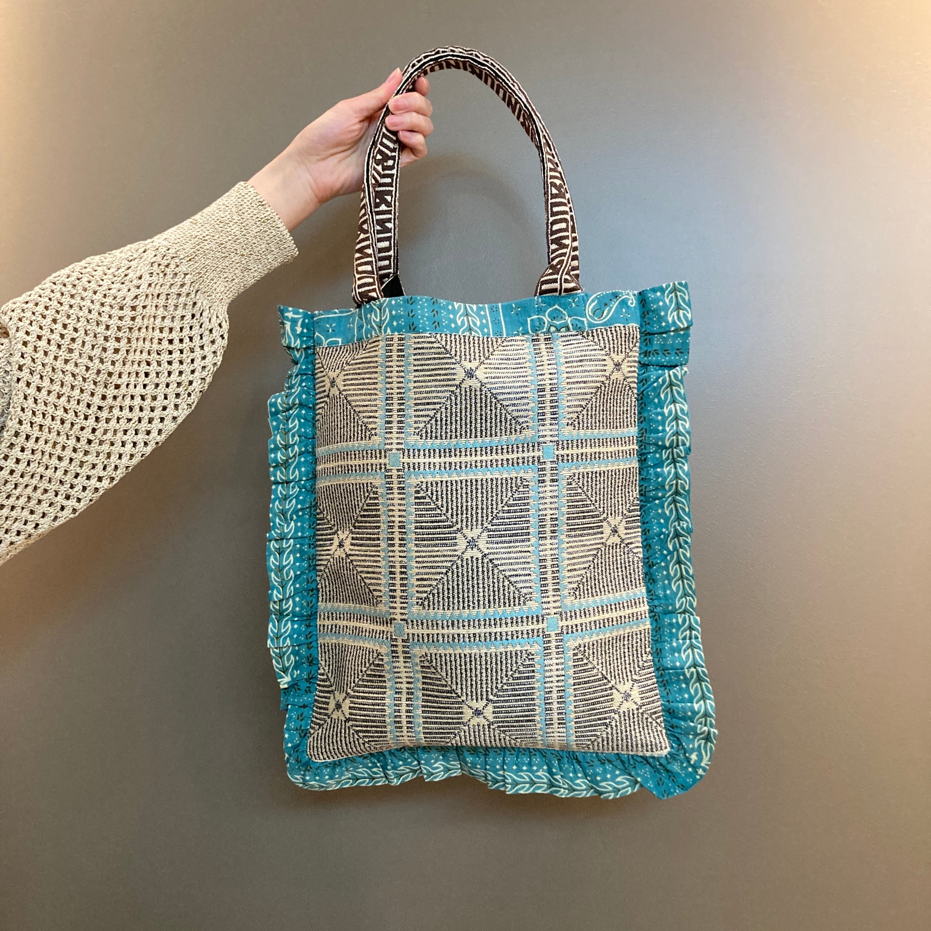 バンダナ柄をミックスしたフリルがアクセントとなり、程よいサイズ感が人気のフリルトートバッグ。持ちやすさに加えて柄のコンビネーションが存在感を引き出します。