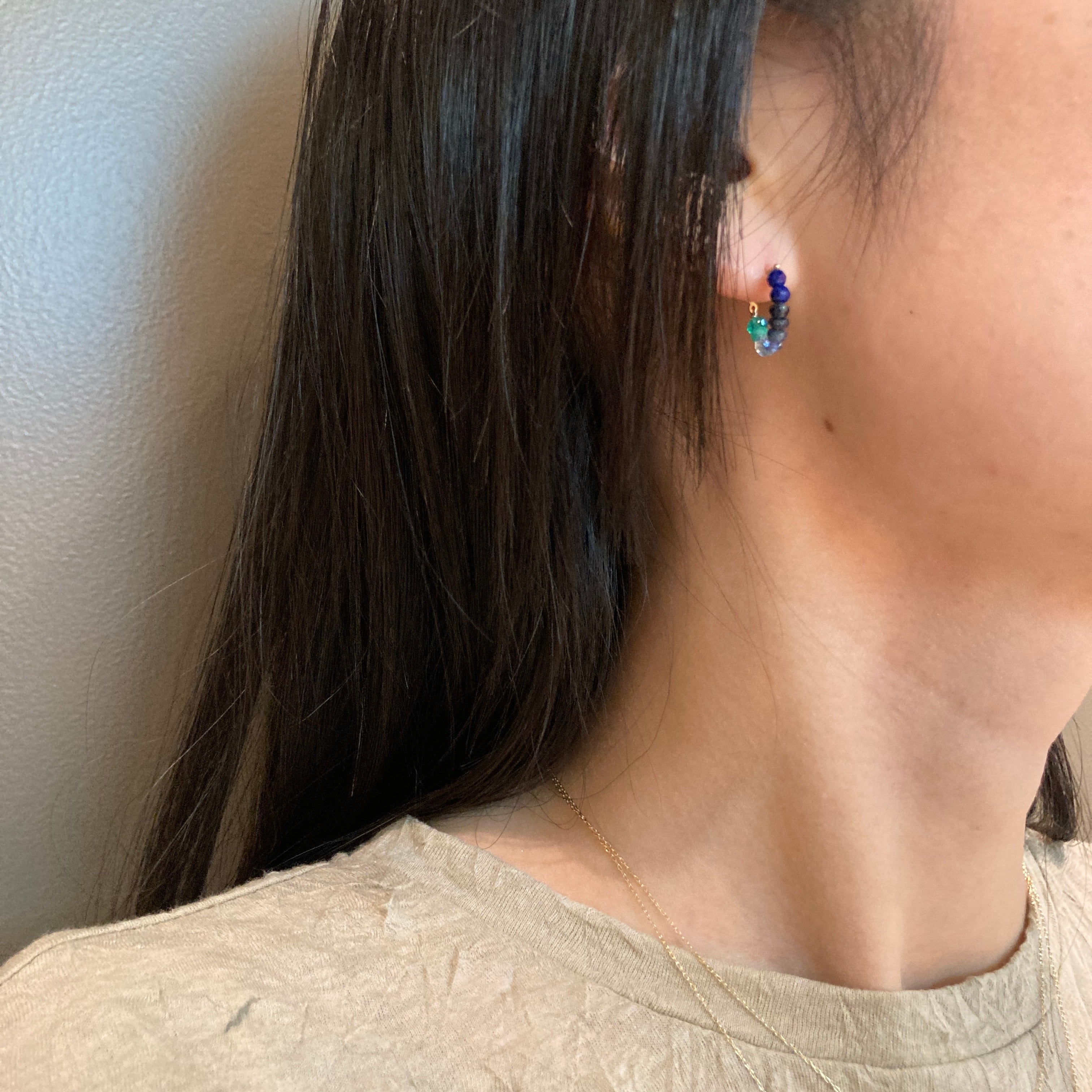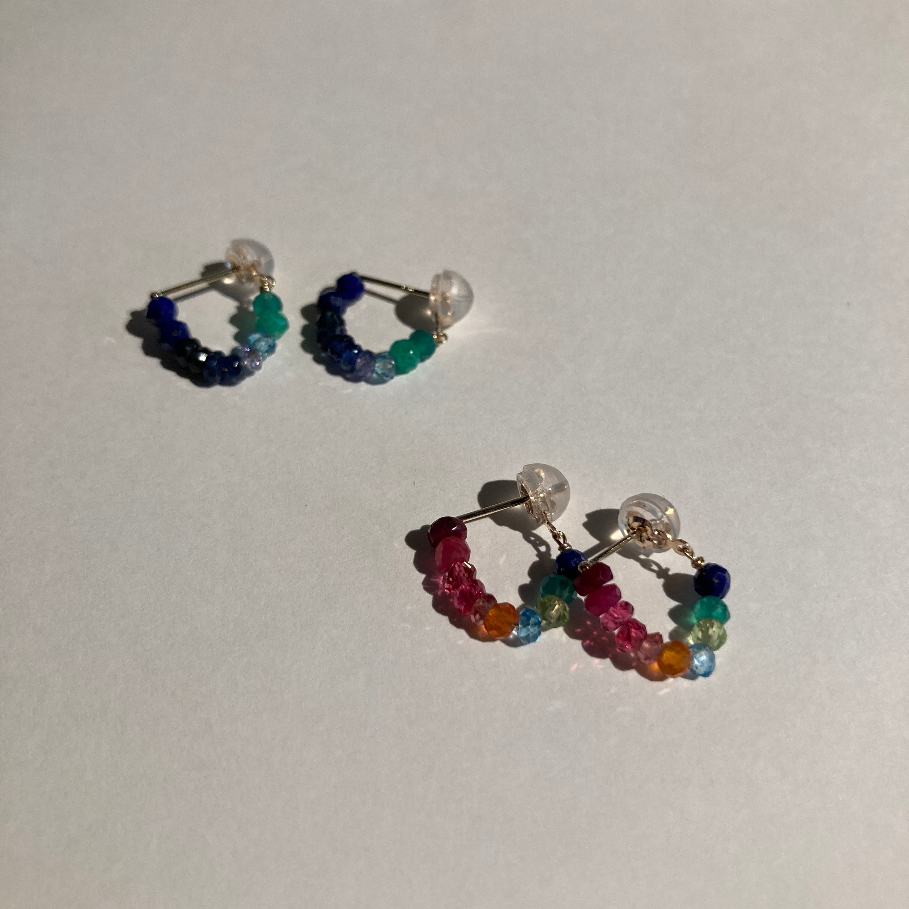 耳元で宝石たちが楽しげに揺れる、フープ型の心ときめくデザイン。デニムなどのラフなスタイルにはもちろん、華やかなドレスアップまで、シーンを選ばず表情を明るく彩ります。