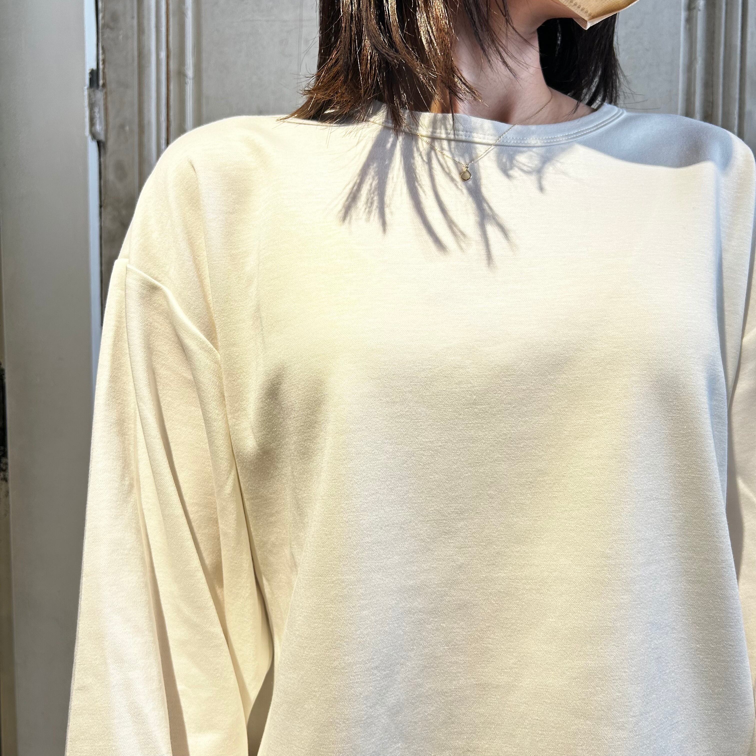 ドロップショルダーのサイズ感とタックスリーブで程良くリラックスして着用ができます。