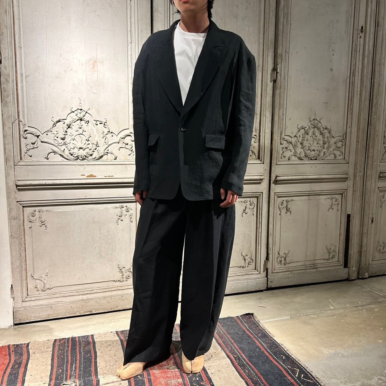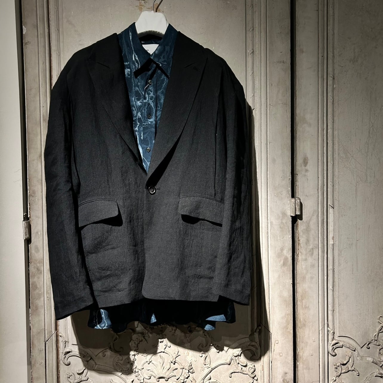 古いシャトル機で高密度で編み込まれた希少なリネン素材を使用した、ピークドラペル1ボタンジャケットです。